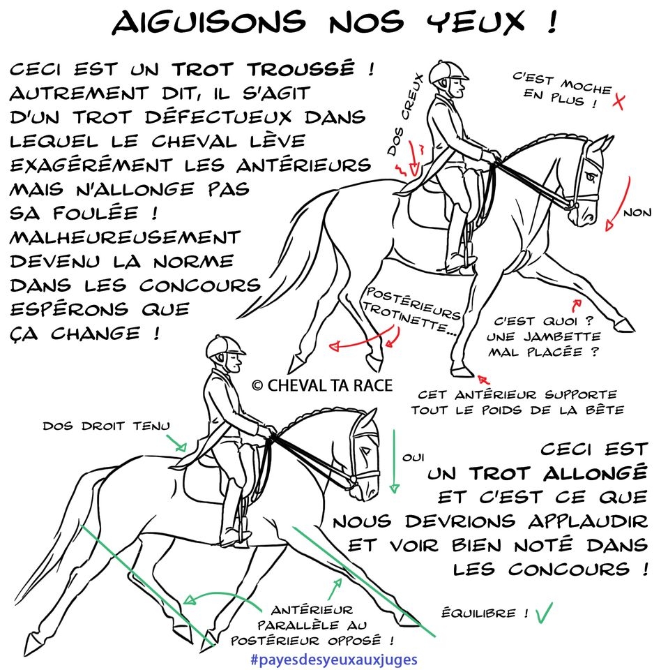 | Dire merci | Et un cheval complètement effondré dans le dos et sur la tronche, mais avec le dos court comme un arabe, il se mejugera très facilement Entièrement d’accord ! Ne pas oublier non plus que sur un programme de dressage dans le trot allongé, il n’y a pas que l’allure qui est jugée, mais aussi les deux transitions. |