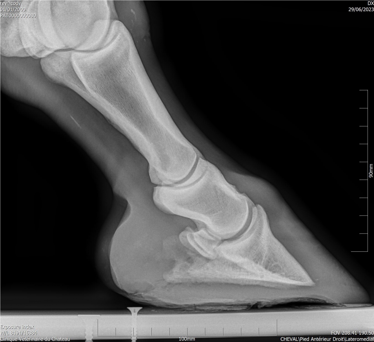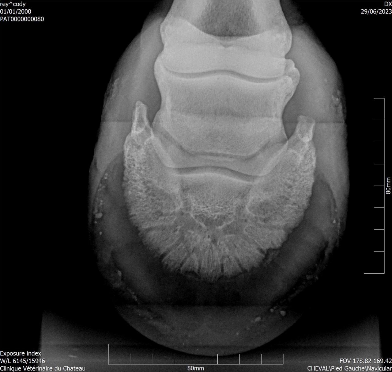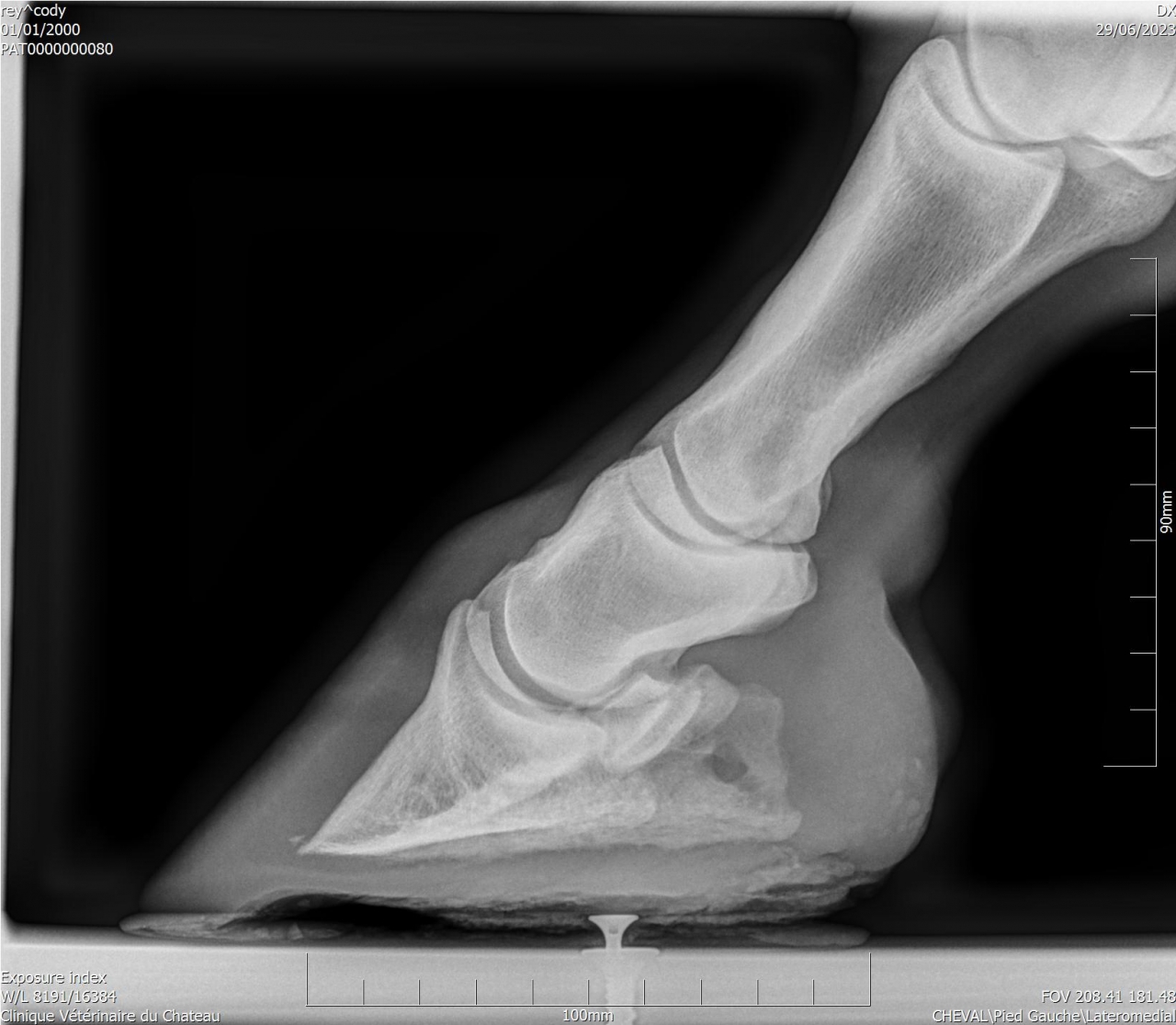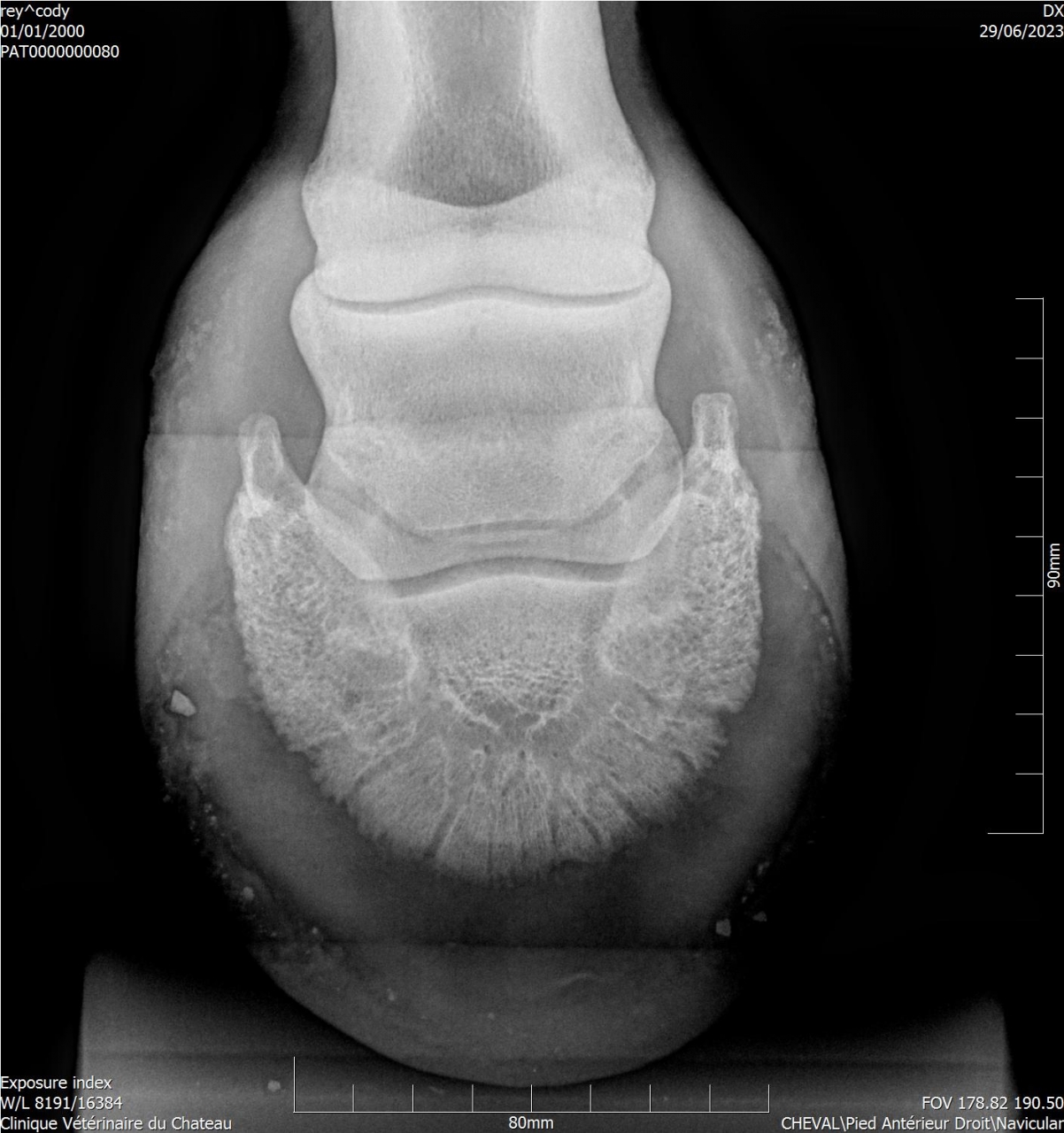 | Dire merci | Deux personnes m'ont parlé des Duplo, les vétos ont conseillé ferrure en M ou ferrure normale ... L'année dernière Cody a été ferré avec des fers oignons et plaques en cuir, ça n'a rien changé. Ces fers ont été conseillés par le maréchal-ferrant car le véto consulté à l'époque conseillait des egg bar. Il me semble qu'avec l'ossification des processus palmaires les fers en métal n'étaient pas l'idéal. Voici les radios : ![]() ![]() ![]() ![]() J'essaye de régler les problèmes physiques pour voir si ça change quelque chose monté. Je commence par les pieds. |