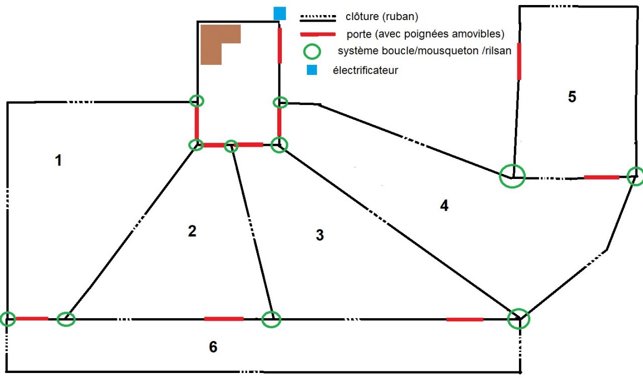 | Dire merci | Les manettes dont tu parles sont vendues sur le site de la Sanglière.![]() Lien Evidemment ça a un coût certain.... (27 € pièce) Moi, j'utilise un système de mousquetons et de boucles et de colliers type rilsan pour électrifier ou non un parc. Je fais cela pour isoler un parc où il n'y a personne, pour "économiser" ma batterie (parce que quand j'ai imaginé ce système, j'utilisais encore l'électrificateur à batterie. Maintenant que j'ai un électrificateur secteur, c'est moins nécessaire) Par contre, pour les parcs internes qui ont un cheval dedans, je mets des poignées (ben oui, les poignées sont isolées, on peut entrer dans le parc sans couper le courant, alors que les mousquetons, n'étant pas isolés, on ne peut pas les manipuler sans avoir coupé l'alimentation électrique avant ^^ ) Poignée accrochée sur une boucle métal : le courant passe dans la porte Tu peux constater sur la 2ème photo qu'il y a un départ de ruban au milieu de l'isolateur, et là, la boucle est reliée à l'ensemble avec un rilsan en plastique (ceux que j'utilise sont déverrouillables et réutilisables) : dans le ruban qui promonge, il n'y a pas de courant qui passe, cette séparation n'est pas alimentée. par contre, le courant passe bien dans le ruban du fond (le plus à gauche) ![]() ![]() Si je veux mettre le courant dans la séparation du milieu, il faudra préalablement que je coupe le courant à l'électrificateur pour enlever le rilsan et raccorder directement le mousqueton sur la boucle de l'isolateur. ce système n'est donc pas adapté à une ouverture/fermeture quotidienne du parc. Pour éviter d'investir dans beaucoup de poignées (celles de la Sanglière sont franchement top, mais assez chères), je mets des boucles/mousquetons/rilsans partout où je n'ai pas besoin de manipuler la connexion tous les jours, et je déplace mes poignées au besoin. Mon paddock distribue 4 parcelles. Les poignées sont sur l'entrée de la parcelle en cours d'utilisation. Le paddock est alimenté en permanence de cette manière, les portes inutilisées sont fermées. Et les séparations et le contour du parc non utilisés sont sur rilsans. Voilà en gros à quoi ça ressemble comme disposition ![]() En ce moment, j'ai 2 parcelles ouvertes aux chevaux (la 2 et la 4). Les parcelles avec les croix oranges ne sont pas alimentées en électricité, celles avec les croix bleues le sont. Le ruban alimenté en courant, c'est tout le périmètre colorié en bleu. ![]() galuska je ne sais pas si c'est assez explicite... Dis moi si tu ne comprends pas. |