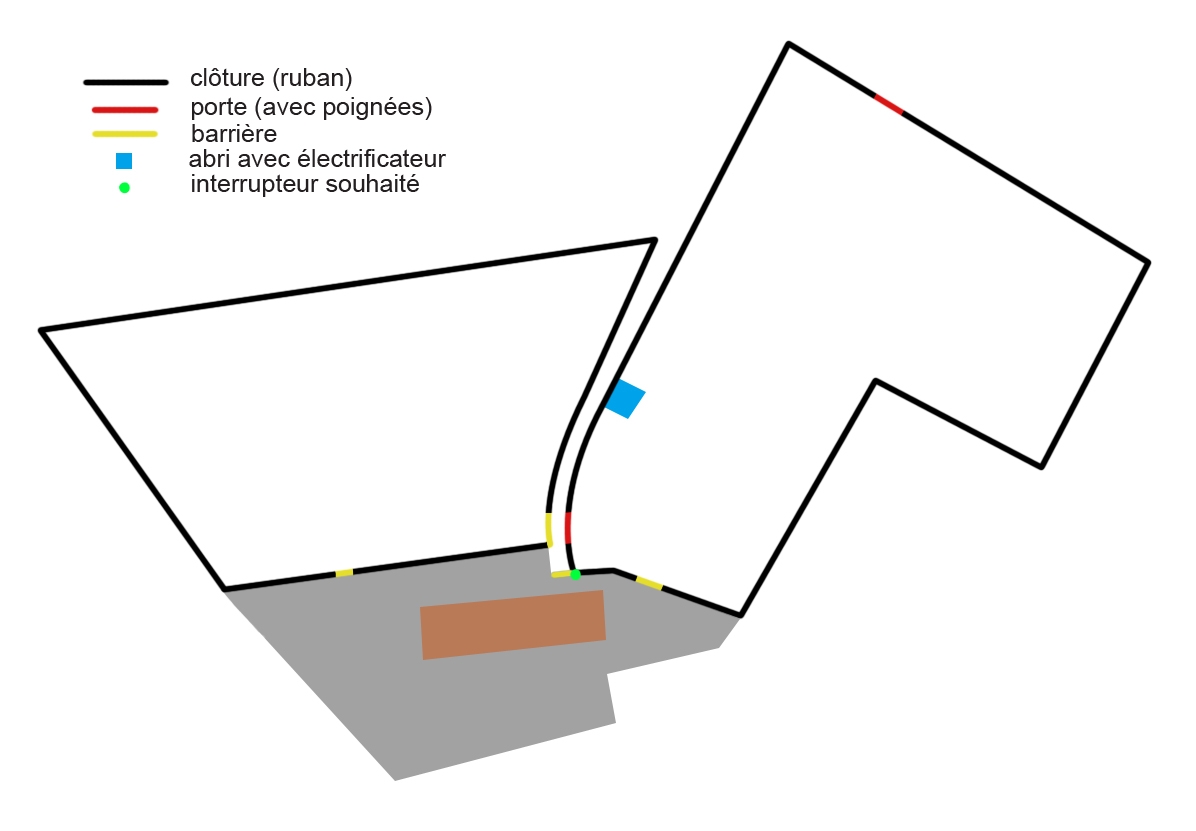 | Dire merci | Ah non beaucoup plus simple que ça, je veux juste pouvoir couper tout quand j'arrive, et remettre tout quand je repars, en fait. Sans devoir faire tout le tour et aller jusqu'à l'abri à chaque fois. Les deux prés sont connectés par un ruban fixe, le jus passe partout. On a créé un accès "rapide" aux prés, la petite barrière qui mène du jardin au couloir entre les deux prés. Ca me permet d'accéder à tous les chevaux direct depuis la maison, sinon je dois ouvrir 2 barrières, passer par la cour, puis aller jusqu'à l'abri etc. Mais... l'entrée du pré de gauche c'est une grande barrière en métal et on a installé une rangée avec poignée juste devant, côté pré, pour que l'étalon ne puisse pas prendre appui sur la barrière pour aller renifler la jument. La barrière s'ouvre vers le pré, ce qui fait qu'à chaque fois que je vais mettre du foin par exemple, je dois enlever la poignée, l'accrocher sur la barrière et enfin ouvrir. Du coup si je veux rentrer dans ce pré, je dois nécessairement couper le jus avant. Et donc, pour l'instant, passer d'abord par l'autre pré afin d'accéder au poste pour le débrancher. Je voudrais pouvoir tout couper et remettre à ma guise, soit depuis l'entrée du couloir, soit depuis la maison mais ça veut dire grimper sur une chaise et débrancher le bon fusible à chaque fois... |