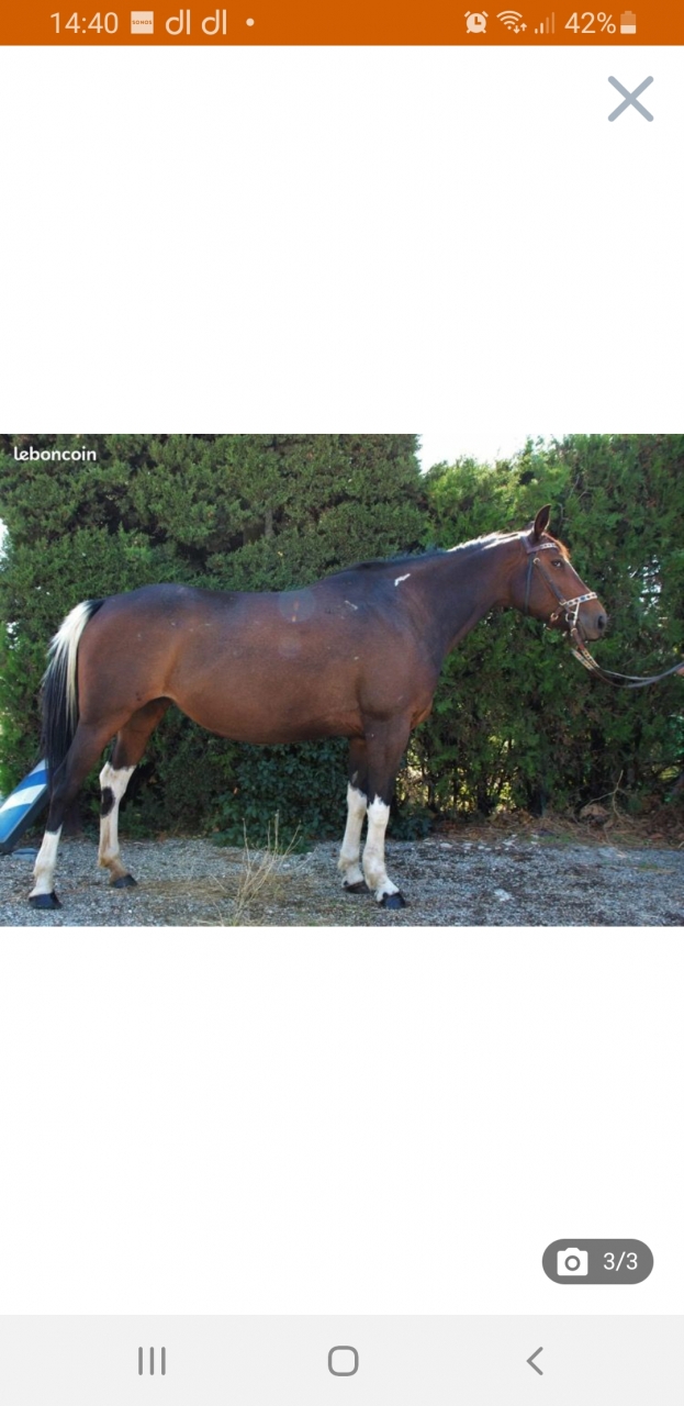 DéconnectéDire merci | 6 ans pas fiable dehors moi je n'insisterais pas. Bien sûr tout se bosse mais c'est se mettre en difficulté avec un cheval qui n'a pas le tempérament pour (et a certainement d'autres qualités). Il y a un groupe Facebook de chevaux à moins de 5000, j'y vois passer plein de chouettes chevaux même à moins de 4000 ;-) Il y a un chouette pur sang arabe dans une écurie du 23 qui recyclé des chevaux d'endurance pas assez endurants. J'ai vu passer l'annonce quelque part sur Facebook (groupe d'endurance ?). |