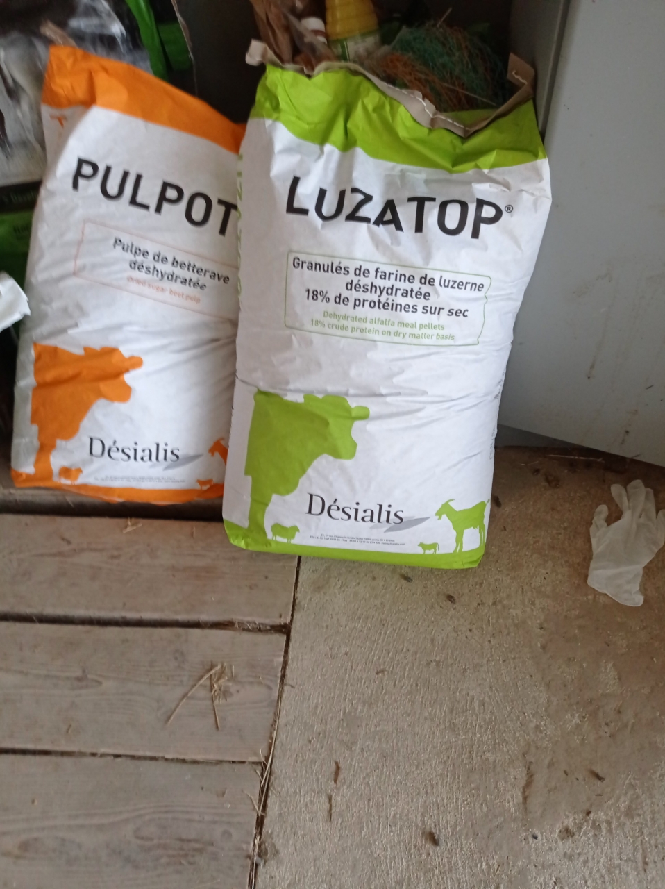 DéconnectéDire merci | mes vieux qui suçottent le foin reçoivent ça tout l'hiver avec du grain. Je fais tremper la pulpe et la luzerne dans un bac pendant 12h. La luzerne gonfle moins que la pulpe mais j'ai effectivement eu des problèmes de bouchon oesophagien avec les granulés de luzerne seuls. Regarde quand même si ton floconné élevage ne contient pas déjà une large part de luzerne (les éléments constituant sont inscrit par ordre décroissant) généralement quand il y a bcp de protéine il y a déjà bcp de luzerne |