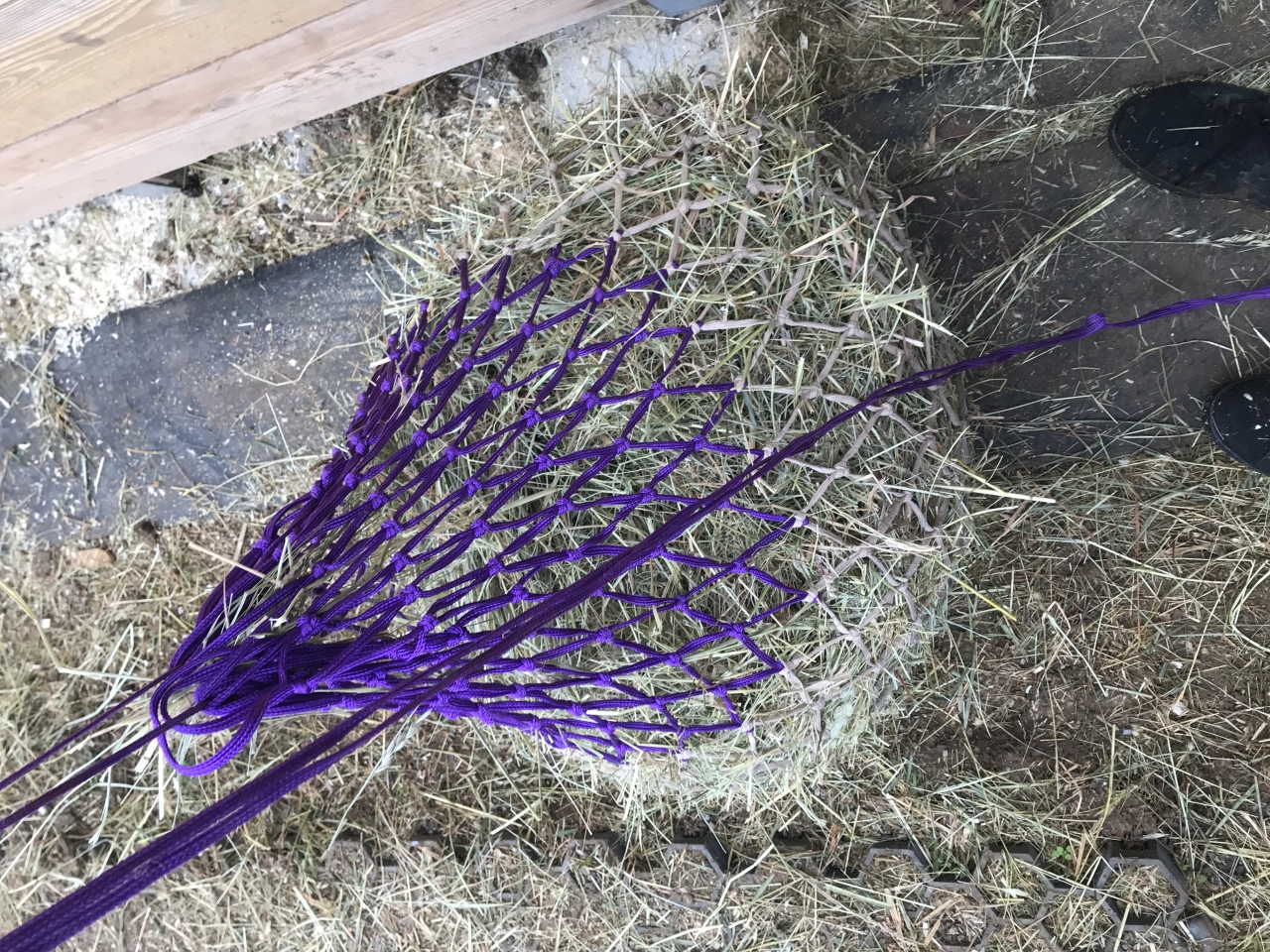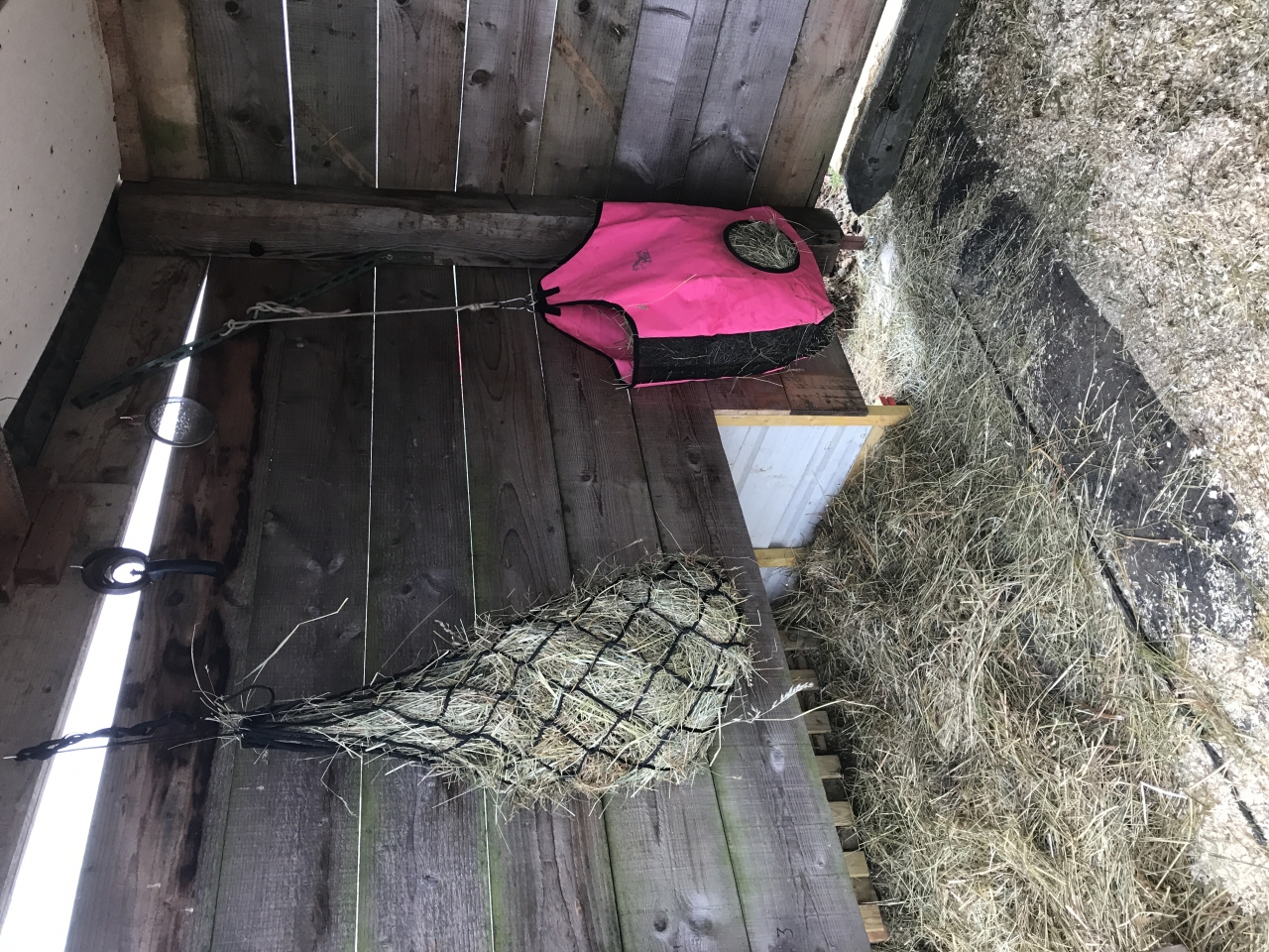 DéconnectéDire merci | Quelques photos pour vous donner une idée de son paddock de nuit. Sac rose + filet noir à son retour Filet violet pour la nuit Et toujours du foin dans la caisse Là j’ai à peu près une botte de petite taille qui part par jour reparti de 16h30 à 23h Je n’ose pas la monter pour la simple et bonne raison qu’elle ne veut même pas aller marcher en main... Elle marche 100m et se campe... J’imagine que les mouvements font bouger l’acide de l’estomac et lui cause des douleurs. En + l’entendre « gémir » quand elle marche ça me crève le cœur |