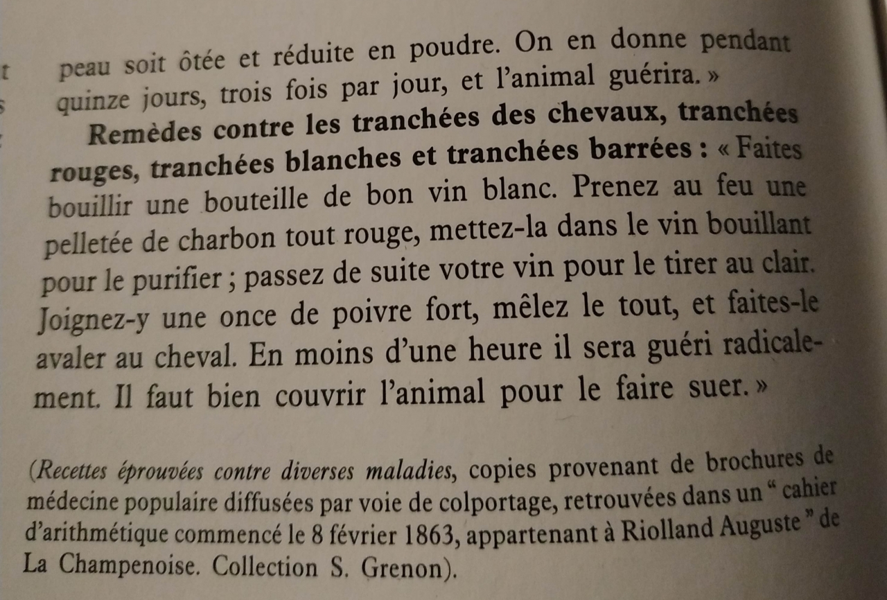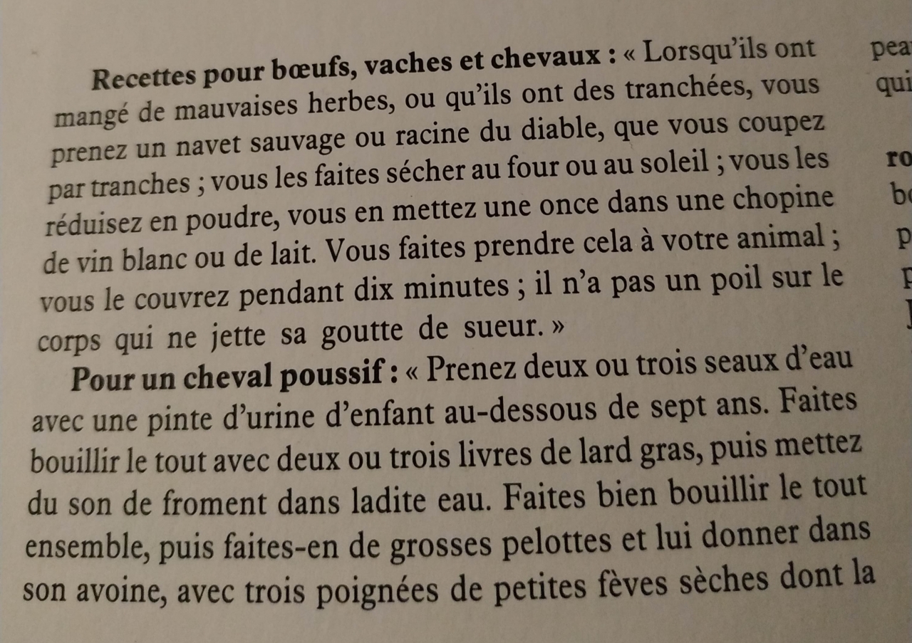 DéconnectéDire merci | C'est vraiment de la médecine "populaire" car ça reste "gentillet" et pas compliqué. La science vétérinaire était bcp plus complexe, axée sur la théorie des éléments, pleine de produits chimiques nocifs (plomb, mercure) avec des recettes compliquées à préparer (mettre ceci, faire bouillir, rajouter cela, laisser réduire 12H, remettre sur feu vif en apportant tel et tel truc, sceller le couvercle puis attendre x heures puis..... ensuite fallait suivre tout un protocole pour guérir, pas juste fourrer le médicament et attendre, mais donner le remède, faire marcher x temps, nourrir d'une certaine façon, recommencer pdt 3j, faire une saignée le 3è jour, récupérer le sang pour préparer l'emplâtre à mettre le 4è jour... je me posais 2 questions à ce sujet : quelle différence entre les tranchées et les avives. Et si on prend de l'urine d'un gamin de 8 ans, ça marche pas ??? |