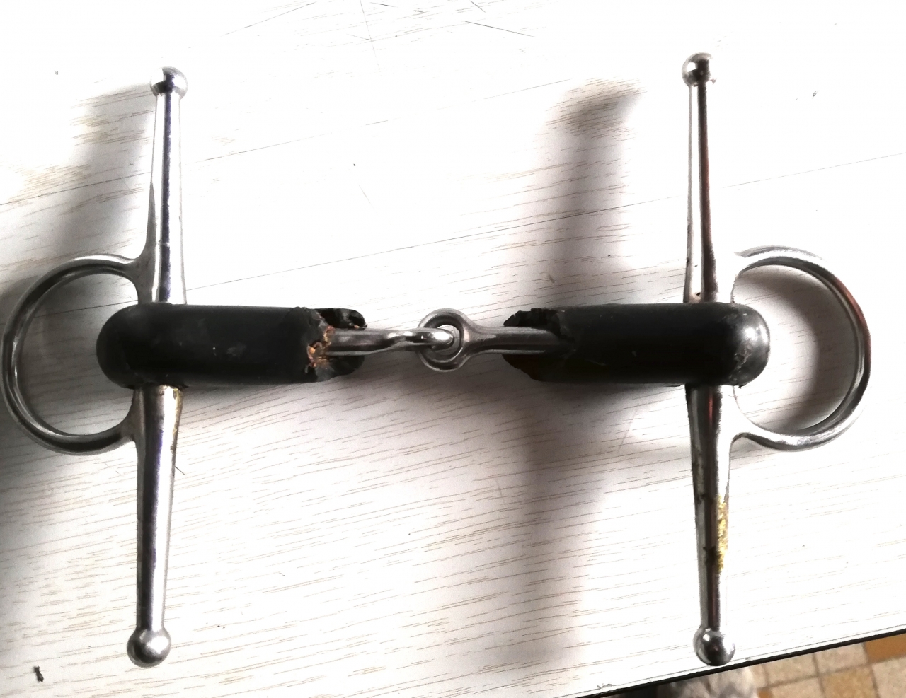 | Dire merci | Au départ, elle avait un mors à anneau double brisure plus fin mais il bougeait beaucoup dans la bouche malgré qu'il était à sa taille. Quand je l'ai faite reprendre par un pro il y a un an et demi car je m'étais fait peur avec elle, il m'a conseillé de lui mettre un mors à aiguille et plus épais car avec les aiguilles ça ne bougerait plus et que le caoutchouc est plus doux pour un jeune cheval. Et en effet, elle a été de suite beaucoup plus à l'aise avec ce mors et je pense sincèrement qu'elle est toujours tout à fait à l'aise car elle le prend en bouche sans rechigner quand je lui mets, sauf quand le caoutchouc commence à s'abimer, ou là, elle se laisse moins facilement faire. Après, je ne touche pas à sa bouche du tout, c'est juste une sécurité au cas ou elle ne voudrait pas s'arrêter quand je lui demande, ce qui n'est pas arrivé depuis des mois. Le mors est là mais je n'ai aucune action dessus... J'ai fais une photo du mors en fin de vie pour que vous voyez le type d'usure... ![]() |