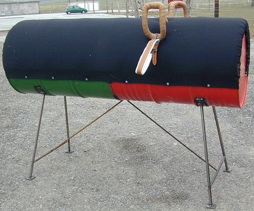 | Dire merci | Ce que tu décris a déjà un autre nom: cela s'appelle un cheval d'arçon, il y en a dans de nombreux gymnases (fermés), et certaines épreuves des Jeux Olympiques se passent dessus. Il est effectivement possible de bricoler un modèle d'exercice avec des bidons. Le premier de ceux que tu montres ne me fait pas confiance du tout: ses pieds sont très faibles, et il est à craindre qu'il ne supporte pas le saut d'un utilisateur pesant plus de 10 kg. Le troisième m'inquiète également; d'ailleurs, il n'est pas fabriqué avec des bidons, mais avec un tréteau, et on peut tout craindre de la solidité de ses charnières. Le deuxième pourrait peut-être convenir, à condition de revoir la fixation du bidon sur les pieds (qu'on ne voit pas sur la photo) et de fixer ces pieds au sol. Pour de nombreux exercices, il est beaucoup plus simple d'utiliser un poney qui ne rue pas. Évidemment, cela ne fonctionne pas en appartement. |