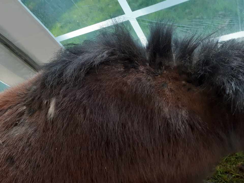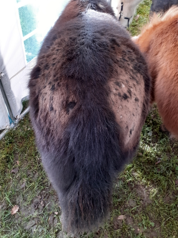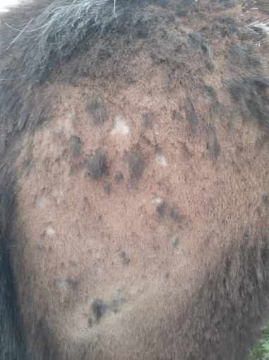 DéconnectéDire merci | Bonjour, je fait partie d'une association, nous avons récupéré un poney, il a une énorme dermite sur les fesses et l'encolure mais pas sur la queue et très peu sur la crinière. J'ai rarement vu une dermite aussi grosse, mais avant de la traiter je voulais savoir si c'est bien une dermite? La ponette qui vivait avec lui n'à rien. Merci bonne journée |