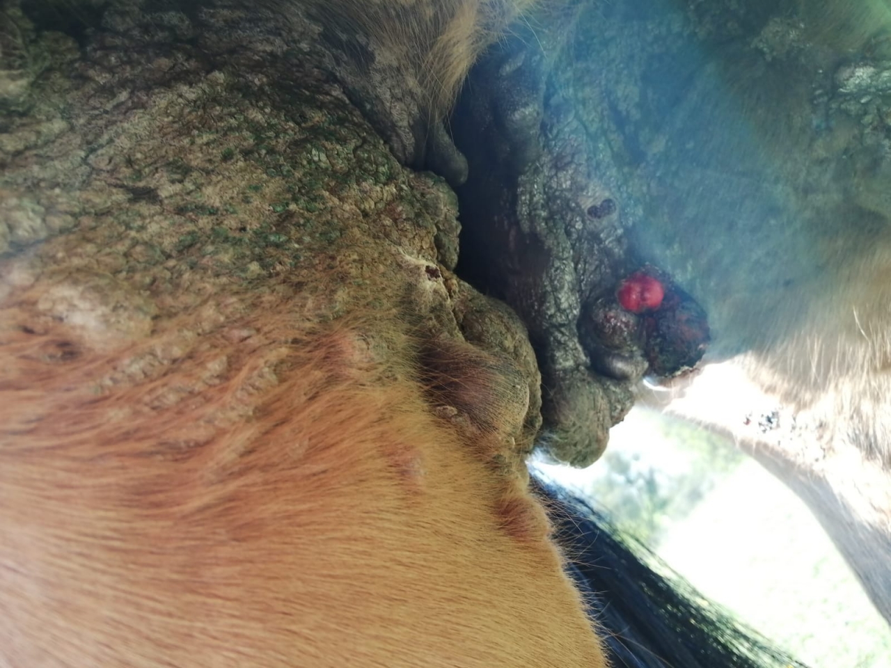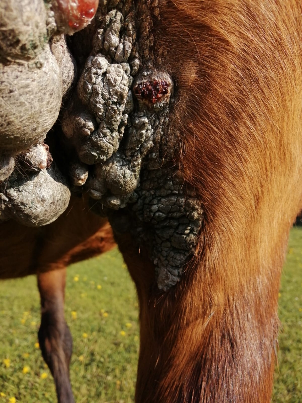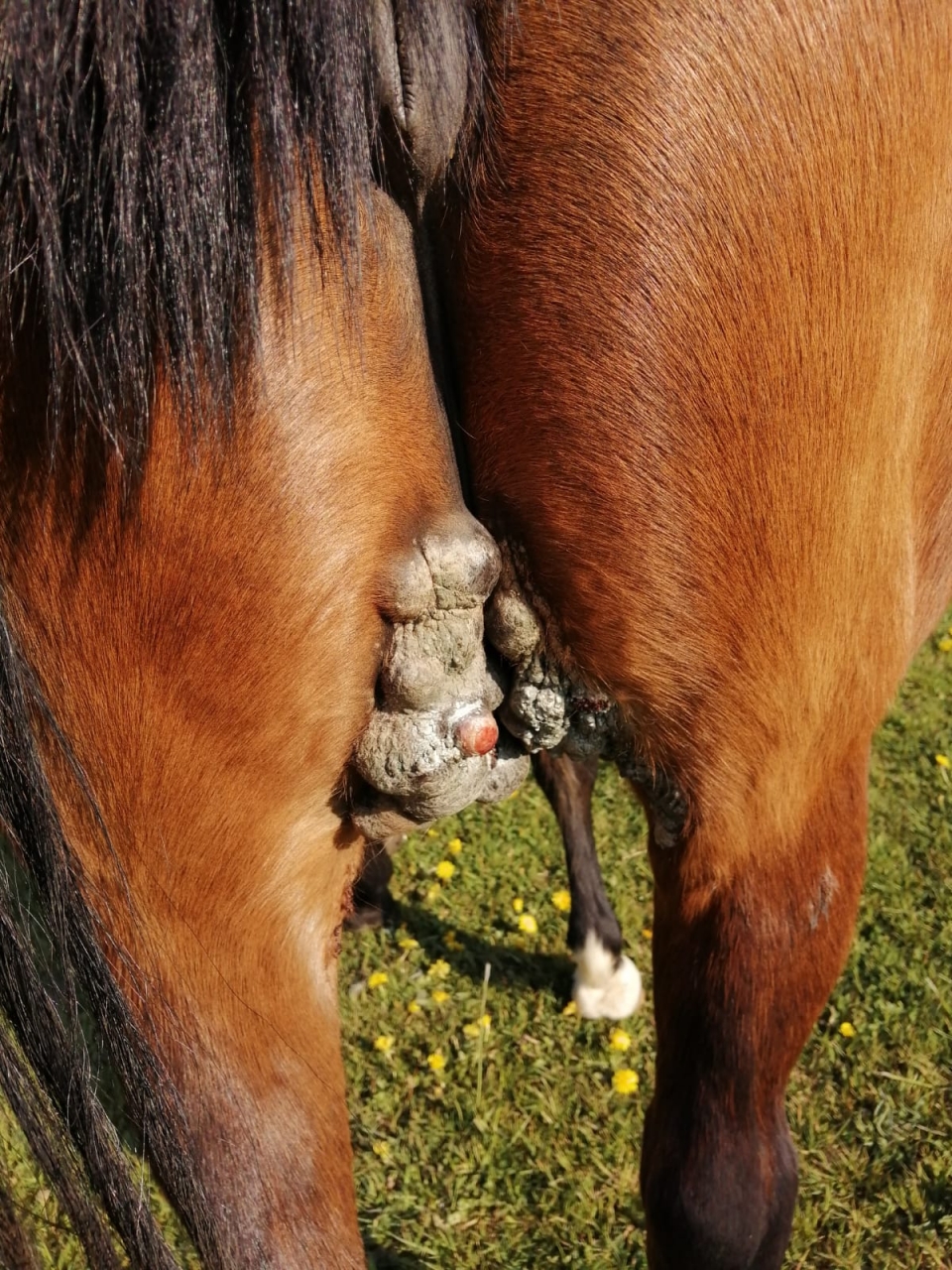 | Dire merci | Je précise aussi que la jument a toujours été suivie par des vetos ! On a encore tenté de supprimer les plus gros, via une très bonne veto, clinique réputée, par élastiques. Résultat : plaie béante longue à se refermer, et hop, ça repousse partout.... |