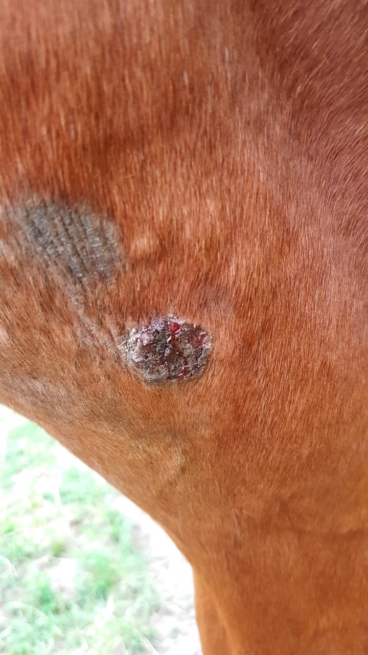 | Dire merci | Le sarcoïde, étranglé par les crins, est tombé .. ouf, un peu de répit. je badigeonne de Verutex .. on verra |