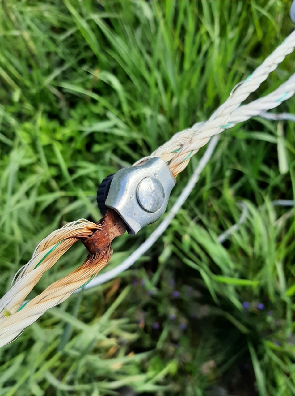 | Dire merci | J’ai trouvé une solution à ça Je ne mets plus du fil comme ça ou du ruban je mets du fil d’alu ça casse si jamais un cheval se prend dedans mais c’est résistant dans le temps et super conducteur et en plus ça coûte moins cher Et au besoin je double avec un ruban ou une cordelette non électrique |