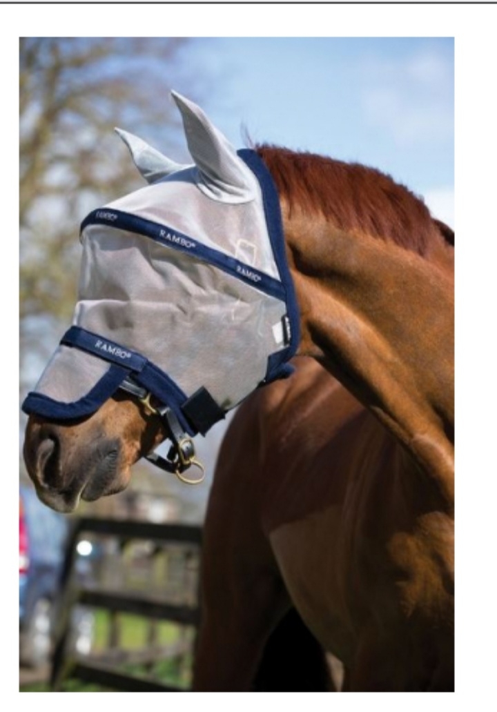 | Dire merci | Je montais un de mes chevaux sensibles avec un masque Rambo sans soucis. ça aurait pu être un autre type de masque, c'est simplement parce que j'utilise des Rambos avec lui au quotidien vu que c'est la seule forme qui lui convient. J'ai eu un pote il y a un paquet d'années qui montait son crème aux yeux bleus avec une casquette pour cheval : un genre de visière au niveau du frontal. Attention pour les concours cependant, je ne pourrais pas te dire précisément dans quelles épreuves, mais il me semble bien que c'est interdit. |