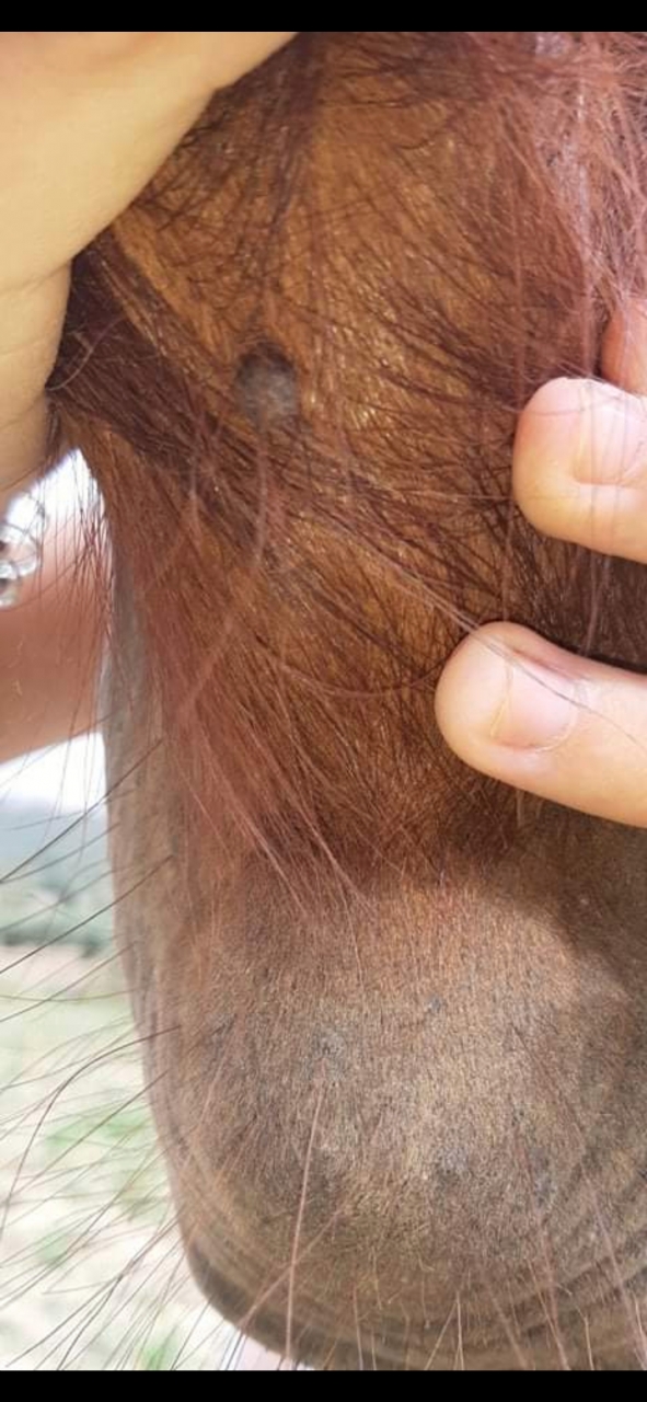 DéconnectéDire merci | Bonjour en allant chercher mon jeune cheval au pré je me suis aperçu qu'il avait unr petite boule au dessus du menton j'ai d'abord pensé à une tique mais je n'ai pas réussi à la retiré puis il me semble qu'elle contient des poils... Elle est mobile et ne le fait pas du tout soufrir. Avez vous une idée de ce que ça peut être ? ![]() |