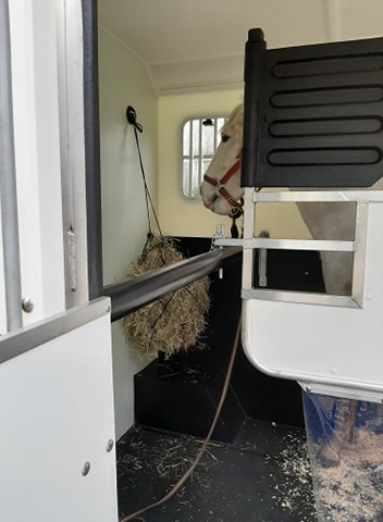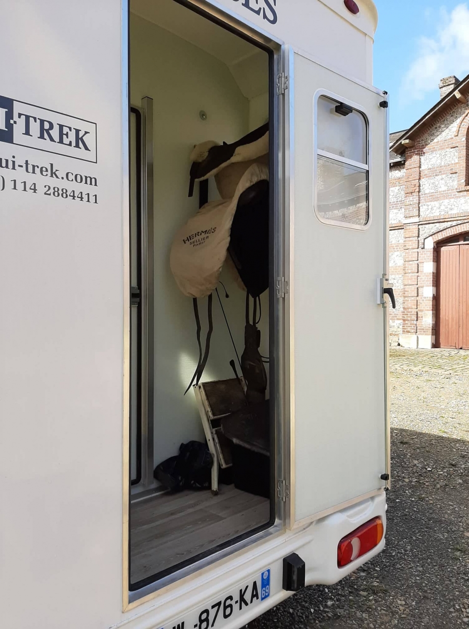 | Dire merci | Depuis que j’ai monté un cheval qui a été très abîmé en essayant de sortir par la sellerie (il a été retrouvé pendant les antérieurs dans la sellerie, les postérieurs dans la partie cheval), je n’imagine pas un camion sans cloison fermée entre la sellerie et l’espace cheval. Comme je n’ai pas de camion, je loue et donc, suivant le loueur, j’ai des modèles différents. J’ai eu un modèle comme la vidéo, c’est très facile |