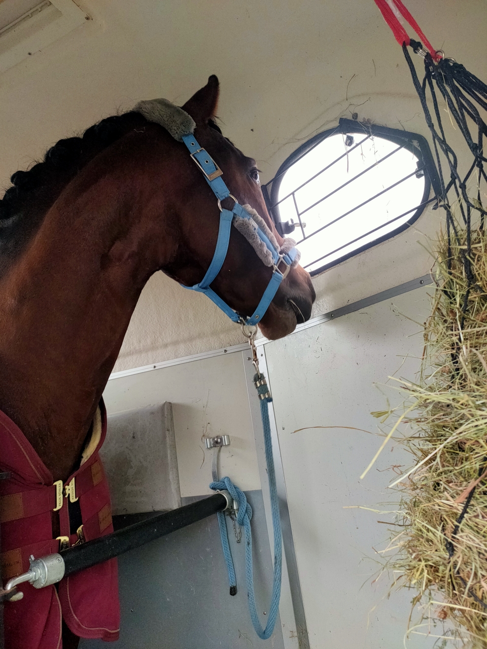 | Dire merci | J’attache le cheval aux deux anneaux en haut dans mon Fautras. Et à l’arrêt, j’ouvre la porte donc attache seulement à gauche pour qu’ils sortent la tête. Le foin est attaché à l’anneau au dessus de la fenêtre avant, mais le filet est posé sur ma malle. Sinon à mon avis ça doit être loin pour qu’ils attrapent le foin? Enfin les miens ne mangent quasiment pas quand je roule. |