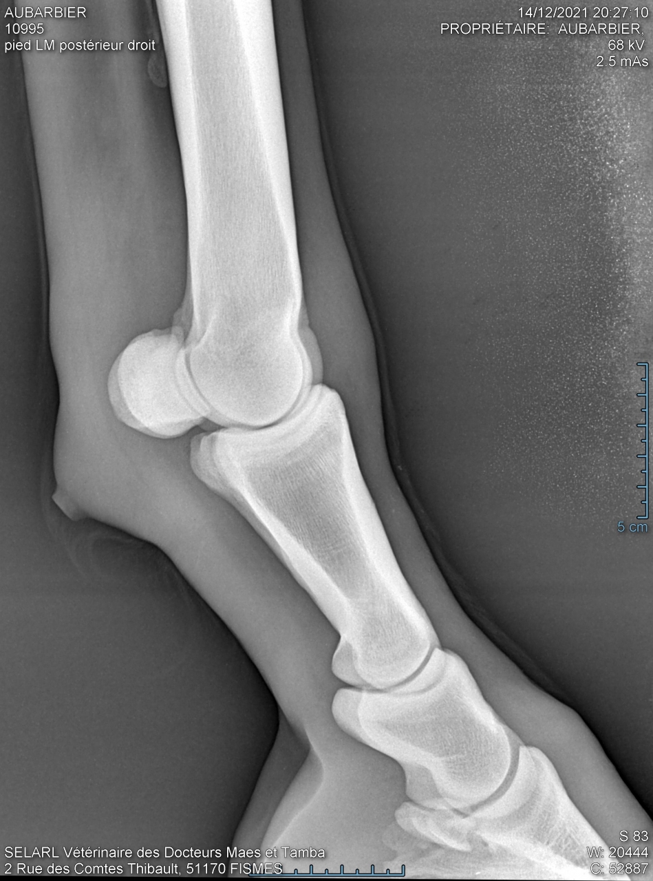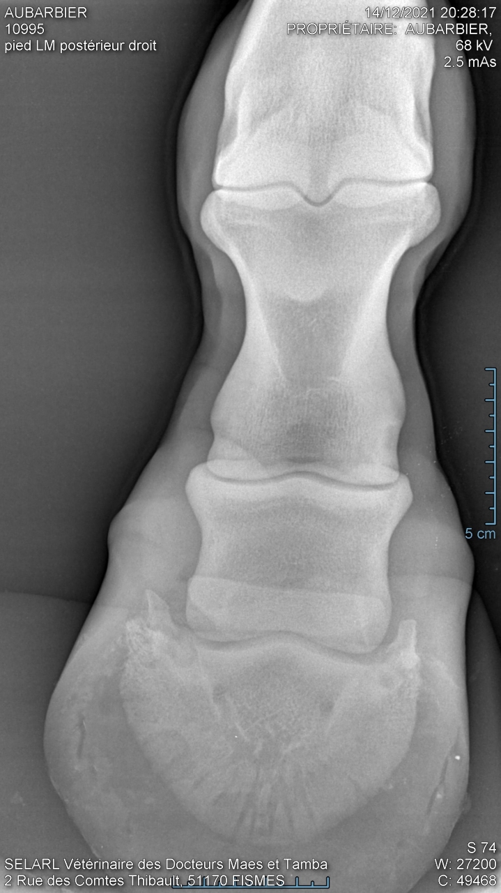 | Dire merci | Il n'est pas sur du tout que la pathologie qui fasse boîter votre jument se voit aux radios. Parfois il faut un scanner en plus. Cela peut être tout et n'importe quoi. D'ailleurs la boiterie peut venir d'un autre endroit que l'endroit radiographié. Sans choc/accident évident, vous pouvez être partie pour une batterie d'examens. Avez-vous fait une visite d'achat ? Y avait -il déjà des clichés ? Vous a t-on parlé d'une fragilité particulière ? D'antécédents ? ... |