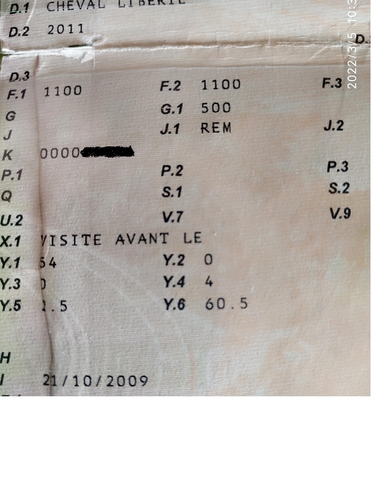 DéconnectéDire merci | digora "Le vendeur lui avait conseillé 1100 (à mon avis pour une question de permis et de PTRA probablement avec son véhicule)." C'est ce qui m'est arrivé quand j'ai acheté mon cheval liberté 1,5 place, neuf, et plus précisement à cause du "PTRA-PTAC" de mon ancien véhicule. PTRA 2980 PTAC 1880 PTAC Van <= 2980-1880 <= 1100 Kg Ci-après la carte grise de mon van: ![]() Tu peux noter que le PV sur ma carte grise est 500Kg (550Kg sur la plaque ci-dessous); ça existe donc en plus léger en restant sur du cheval liberté d'occase. Je t'épargne le calcul: 685-550= 135 Kg. ![]() |