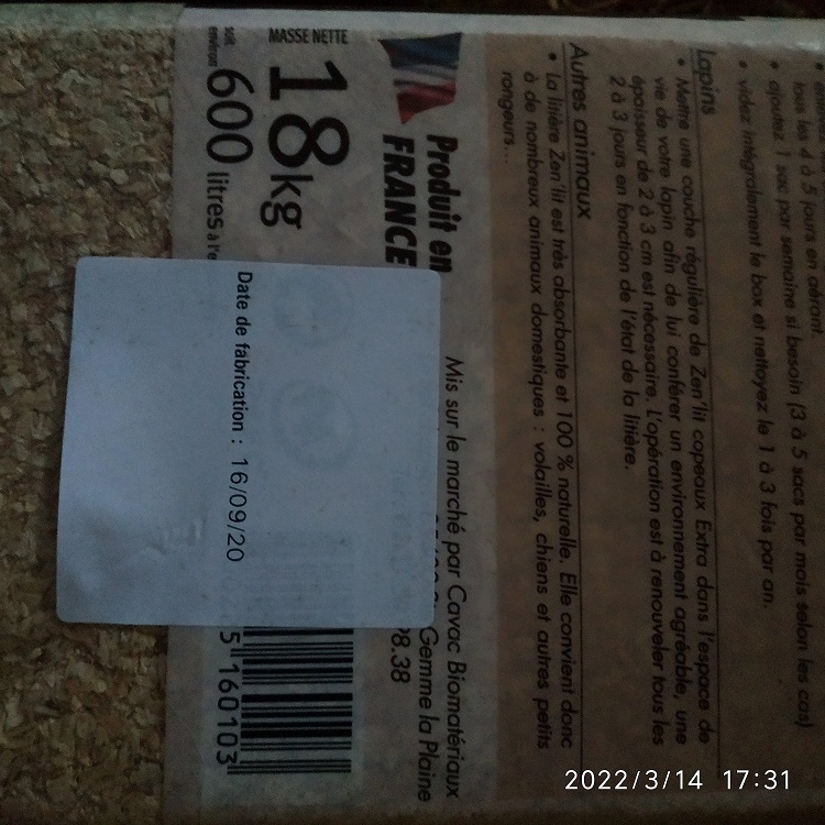 DéconnectéDire merci | Regarde sur l'étiquette du sac. Le volume et le poids sont indiqués sur le sac (cf photo) que j'utilise. C'est aussi du dépoussiéré. Pour avoir le volume en m3 d'une tonne je diviserais le volume indiqué en en L (600L) par le poids indiqué en Kg (18Kg) 600/18 = 33,333m3. ![]() Dans le détail si je ne me trompe pas: Tu cherches un volume en m3 (1000L) pour une Tonne (1000Kg). Tu connais le volume (600L) pour 18Kg de copeaux. Tu peux donc calculer le volume d'une tonne de copeaux avec la règle de trois. On a 600l pour 18kg, pour 1000 Kg(1T) cela fait un volume en litres de: (600L/18Kg)*1000Kg= 33 333 L On obtient des litres, reste à convertir en m3, avec un des nombreux convertisseurs en ligne (https://www.unitjuggler.com/convertir-volume-de-l-en-m3.html?val=33333) Ou encore la règle de trois: On a 1m3 pour 1000L, pour 33333L cela fait un volume en m3 de: (1m3/1000L)*33333L= 33.333 m3 Message édité le 14/03/22 à 21:18 |