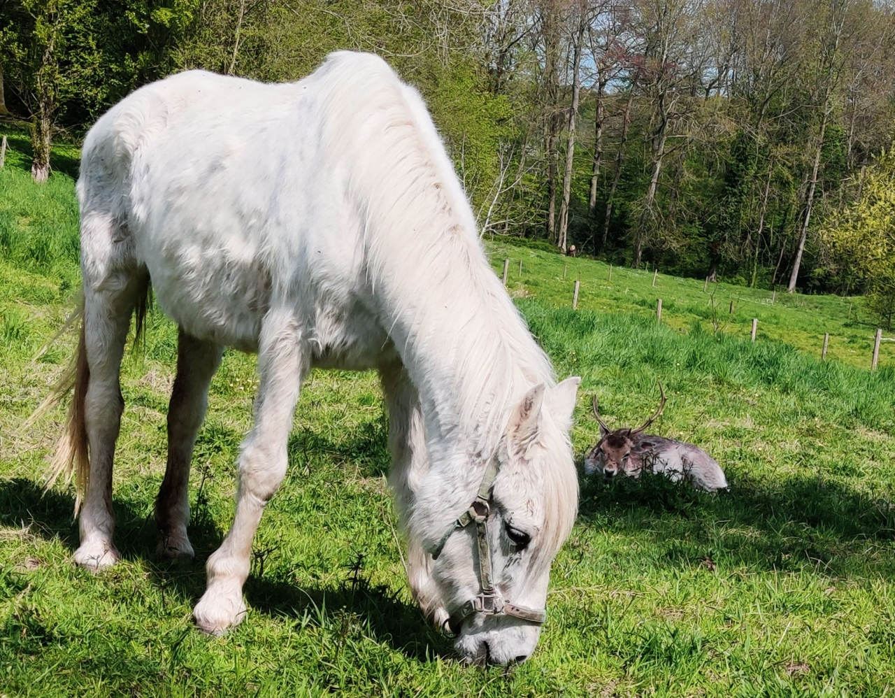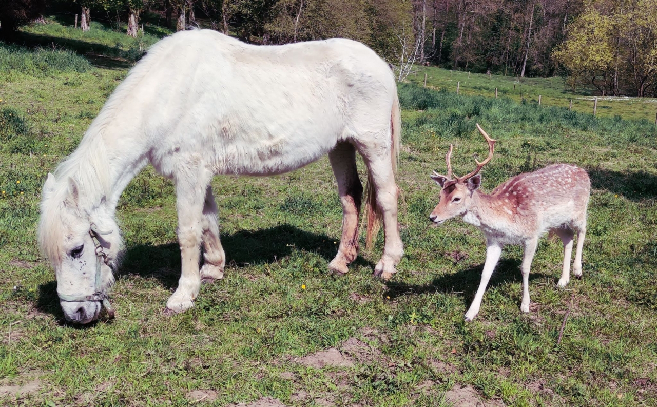 DéconnectéDire merci | Mon tout vieux cheval s'est fait un nouvel ami, un daim s'est invité dans sa prairie et ne la quitte pas d'une semelle. Aucune idée d'où vient cette bête, personne ne le réclame. Il est habitué aux humains vu qu'il prend de la nourriture à la main mais n'est pas manipulable. Mon cheval doit sous peu quitter cette prairie qui n'était qu'un prêt très provisoire. Pour elle je ne m'en fais pas trop pour sa santé, elle est en toute fin de vie c'est une question de semaines tout au plus quelques mois. Mais si elle rejoint la prairie d'été Bambi sera en contact avec mes 2 autres qui sont vieux mais ont de bonnes chances de vivre encore quelques années. L'endroit serait idyllique pour Bambi (parc de chateau avec bois, étangs etc, les chevaux n'ayant accès qu'à l'herbe). J'ai peur de Lyme (même si je pense que c'est plutôt du 'gibier sauvage') ou de 'vers' particuliers. Bref je me suis attachée à Bambi, j'ai peur qu'il ne termine sur la route si je lui enlève sa copine cheval mais je n'aimerais pas mettre mes autres chevaux en danger. Quequ'un a de l'expérience dans ce cas? ![]() ![]() ![]() |