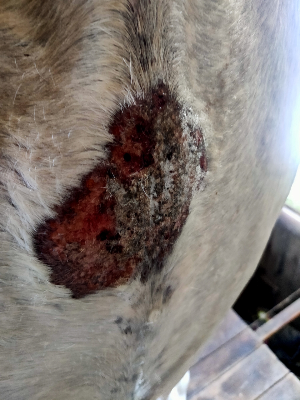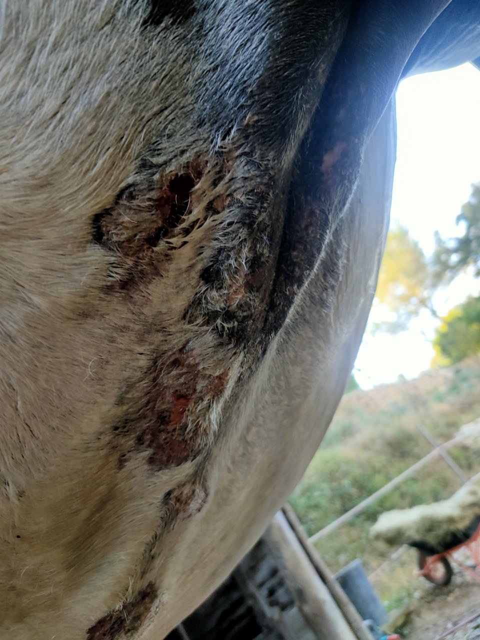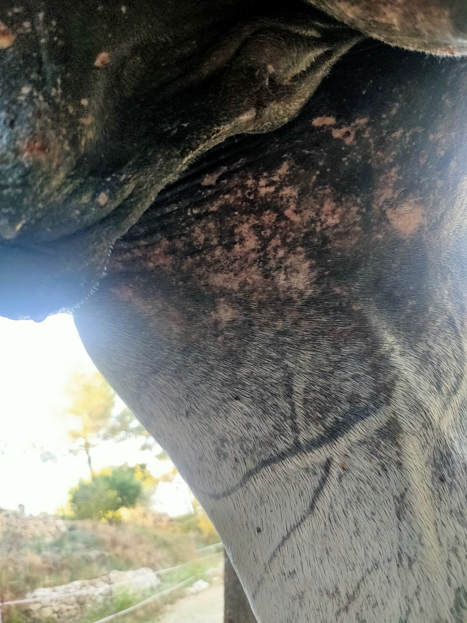| Dire merci | Chaque année c'est pire takhan ne supporte plus l'été et ses insectes. J'ai eu la COVID cette semaine donc je n'ai pas pu aller les voir 3 jours et voilà comment je le retrouve : ![]() derrière les coudes, entre les cuisses c'est pareil je vous fais grâce des photos...D'habitude je gère avec vaseline et/ou aluspray mais là c'est vraiment cracra. (Il a une couverture avec protection ventrale mais c'est pas suffisant). pili penses tu que des cataplasmes d'argile enrichi HE soit judicieux ? Ce matin j'ai tout nettoyé, désinfecté doucement, aluspray par dessus et couverture mais comme dit précédemment elle sert pas à grand chose les bestioles passant dans le bâillement. |