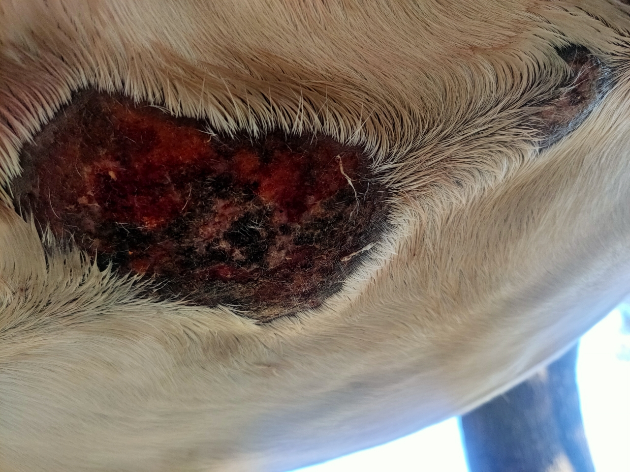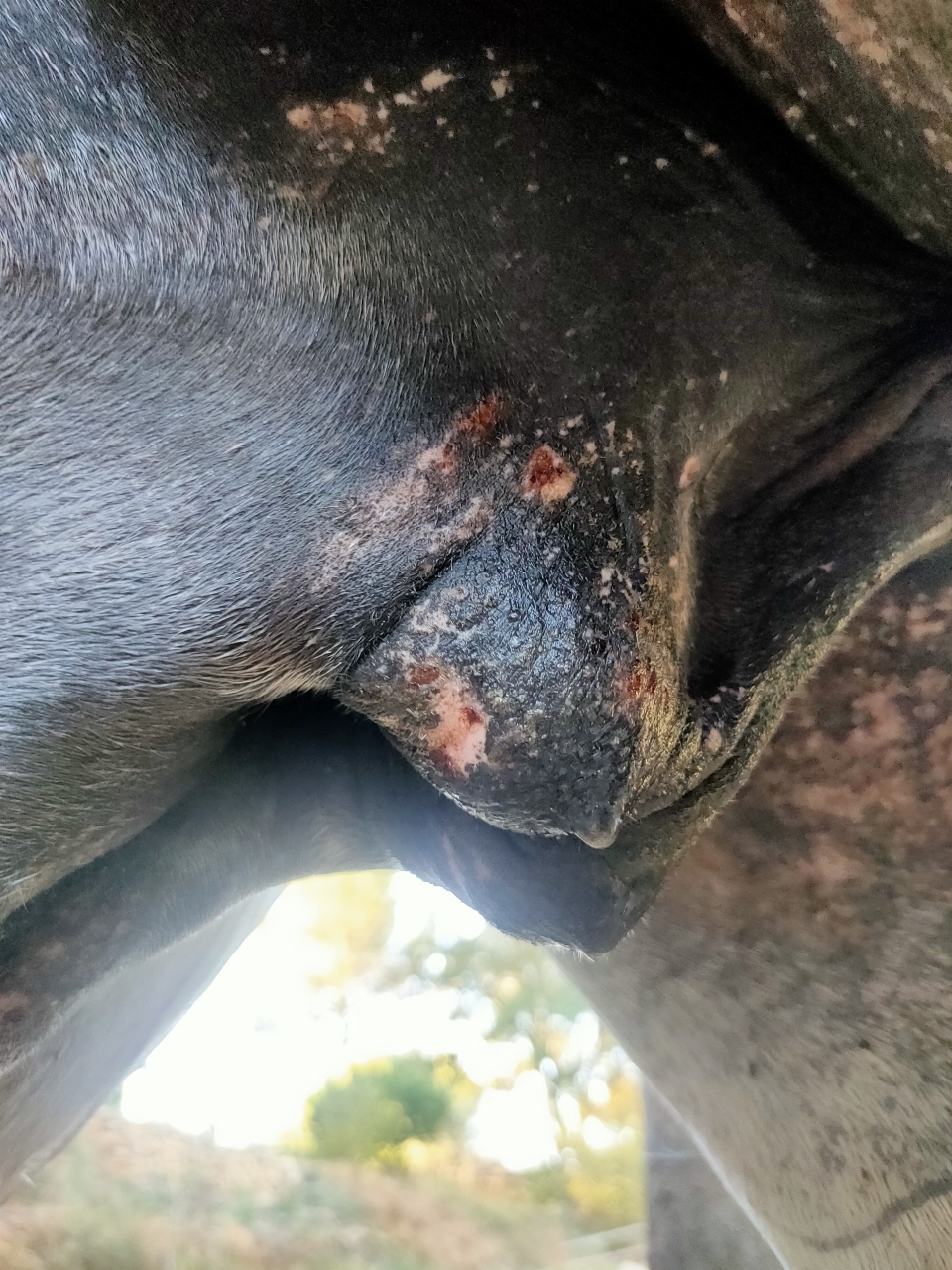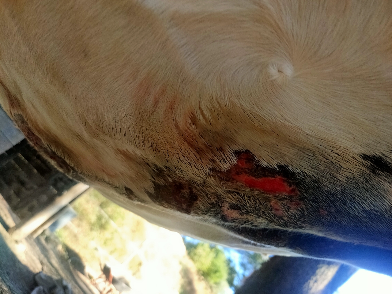 | Dire merci | Chaque année c'est pire takhan ne supporte plus l'été et ses insectes. J'ai eu la COVID cette semaine donc je n'ai pas pu aller les voir 3 jours et voilà comment je le retrouve : ![]() derrière les coudes, entre les cuisses c'est pareil je vous fais grâce des photos...D'habitude je gère avec vaseline et/ou aluspray mais là c'est vraiment cracra. (Il a une couverture avec protection ventrale mais c'est pas suffisant). pili penses tu que des cataplasmes d'argile enrichi HE soit judicieux ? Ce matin j'ai tout nettoyé, désinfecté doucement, aluspray par dessus et couverture mais comme dit précédemment elle sert pas à grand chose les bestioles passant dans le bâillement. |