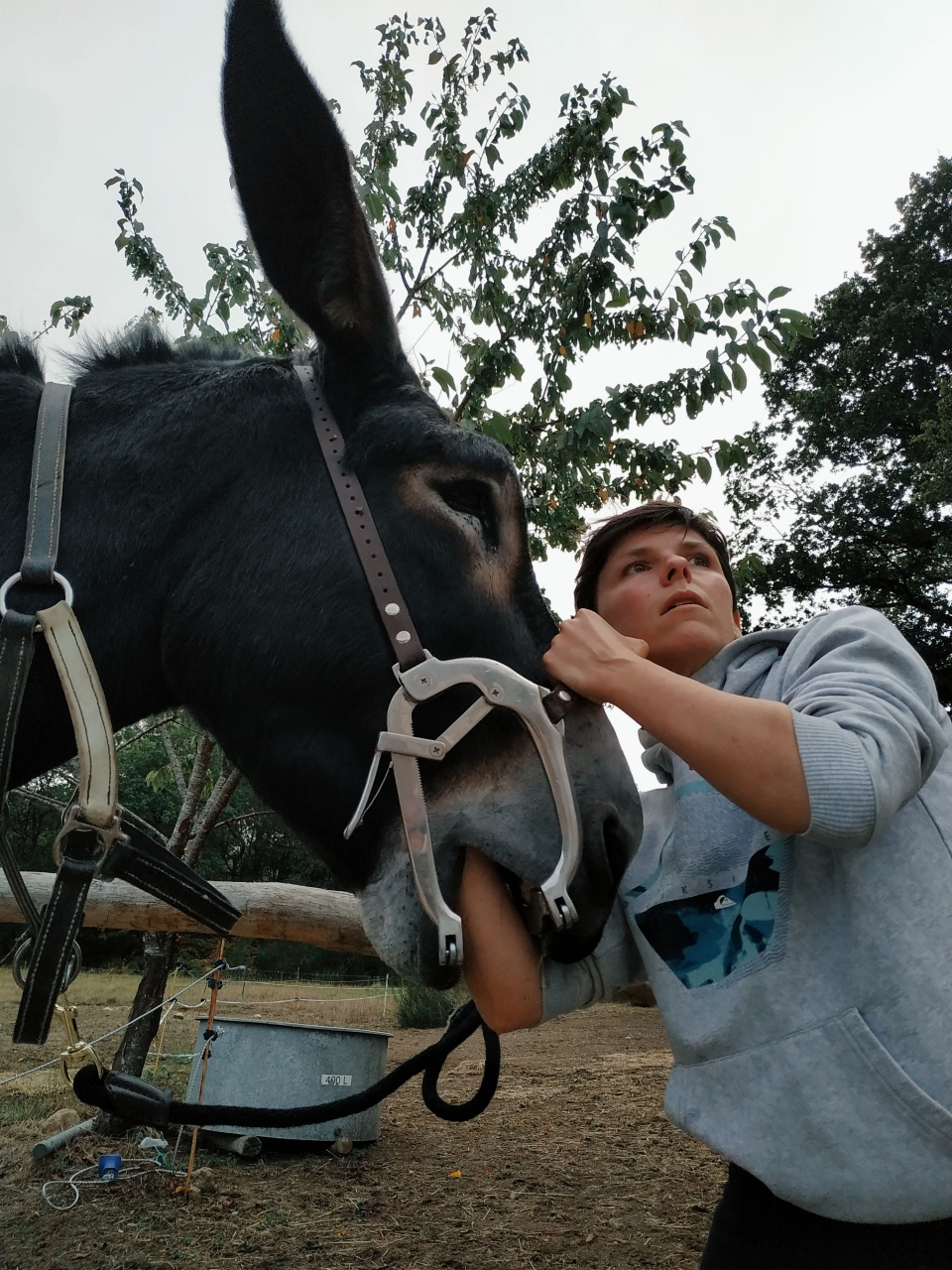| Dire merci | Certains d'entre vous ont suivi les soucis de santé de mon âne, je redétaillerai si besoin. Aujourd'hui, pour la première fois depuis le mois de mai, mes vétérinaires ont annoncé que la cicatrisation de la gencive était suffisamment avancée pour ne plus nécessiter un RDV véto par semaine. Il n'est plus nécessaire d'y mettre un amalgame dentaire. Cependant, le trou créé par l'arrachage de la molaire est toujours conséquent (on y enfonce encore une phalange) et les aliments s'y accumulent. Pour éviter tout risque de nouvelle infection, il va falloir nettoyer la bouche à grande eau tous les deux jours. Or le fond de la mâchoire est inaccessible sans un ouvre bouche. Je peux faire les soins moi-même mais ce matériel coûte 450€... Que je n'ai plus, après environ 5000€ de frais accumulés. Les vétérinaires me proposent de me prêter le leur en dehors des heures d'ouverture de la clinique (je ne sais pas comment j'aurais fait sans leur soutien !) mais cela représente 1h15 de route aller retour tous les jours. Je cherche donc une bonne âme équipée d'un ouvre bouche dont il ne se sert pas et qui serait ok pour me le louer ou prêter pendant un mois ou deux afin de sauver définitivement mon âne de ce cauchemar. Oui, j'ai de l'espoir ![]() |