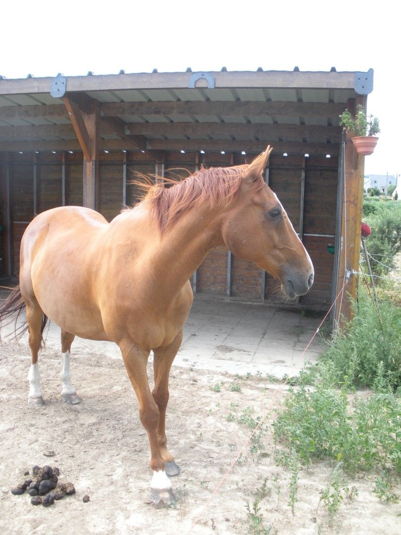 | Dire merci | J'ai retrouvé une vieille photo sur laquelle on voit feu mon cheval ( ) et l'abri en arrière plan avec les dalles mentionnées. On voit également les géraniums suspendus qui avaient vocation à éloigner les insectes. Avec un succès mitigé ![]() |