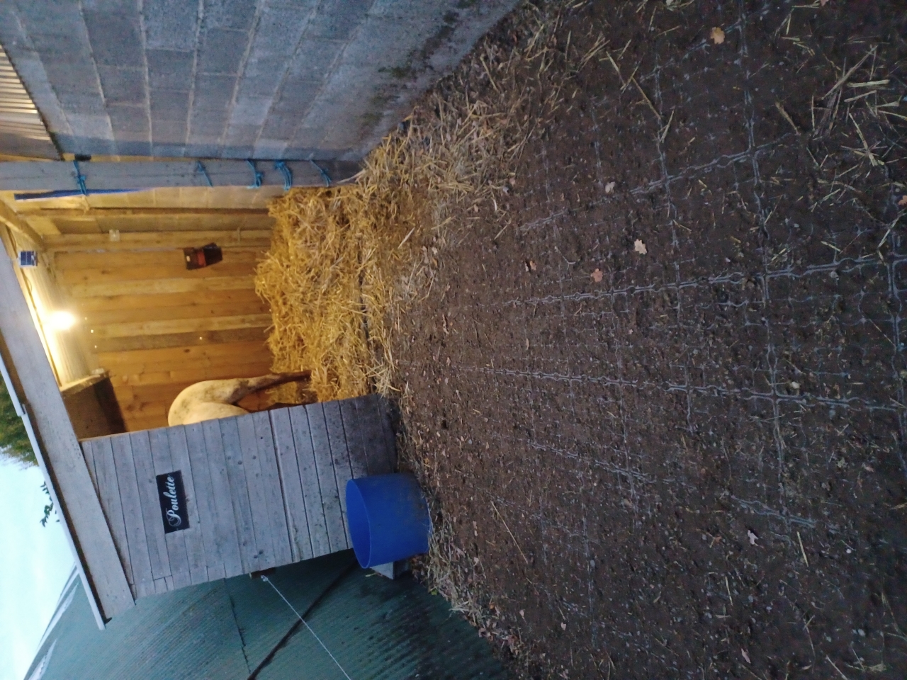 | Dire merci | Je sais que ça ne restera pas aussi beau mais au moins, ils ne s'enfonceront plus de 30 ou 40 cm devant les box. On peut d'ailleurs voir à gauche la passerelle anti-boue que j'avais fait l'année dernière et que les chevaux utilisaient avec plaisir |