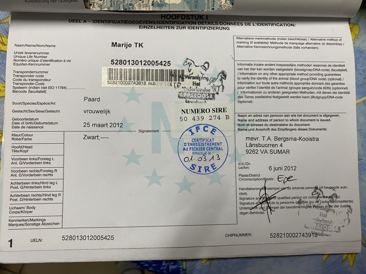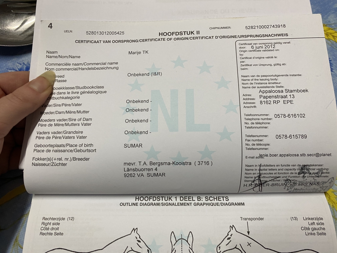 DéconnectéDire merci | alors, aux Pays-bas il n'y a pas de HN (ou une quelconque banque de données centrale pour équidés) et encore moins à cette époque là. Donc pour obtenir un passeport (obligatoire) pour son cheval il faut s'adresser à une 'fédération' (à qui il faut payer une cotisation) qui peut émettre un passeport. L'appaloosa en NL c'est une des moins chères et des plus laxiste (avec les Tinkers) Donc ta jument est tout simplement ONC (pcq la fédération des frisons ils n'inscrivent que des frisons pur jus avec les parents qui ont été vérifiés, les poulains présentés etc, ce sont les fameux papiers jaune et verts qui valent à eux seuls leur pesant d'or). Savoir si Madame Bergsma a effectivement fait naître ta jument elle seule le sait, google ne raconte rien, en tout cas pas avec le double nom. Mais l'endroit est en pleine Frise où il y a plein de Frisons elle a peut être juste croisé sa jument avec son entier sans trop se tracasser des papiers |