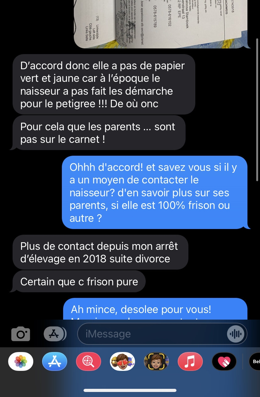 | Dire merci | beeboylee dejavu Bonjour! je vous joint des photos du livret, de ma jument a 8 mois et des photos de maintenant, soit 10 ans après ! J'étais petite et franchement, je n'y connaissais pas grand chose, mais c'est vrai qu'avec du recul, un poulain entre 6 et 8 mois dans un élevage où il n'est pas né... Après, il avait ses propres produits avec son étalon, mais il est vrai que Marije était dans un "lot" : lorsqu'on a été la visiter, elle était dans un grand parc avec une bonne quinzaine de poulains, tous plus ou moins du même âge ... En soit, je trouve perso qu'elle ressemble bien à une frisonne, après si c'en est pas une moi je m'en fiche! j'aimerais juste savoir d'où vient mon bébé 🥲 Essayer d'avoir des infos sur ses parents ou autre, mais franchement là je suis complètement perdue et je ne sais pas si un jour j'arriverai à retrouver ça.... de par son livret, ma jument est un cheval fantôme🥲 née chez un naisseur introuvable .. Mais du coup, je ne savais pas ce qu'était l'instance emetteur, dejavu peux-tu m'expliquer ce qui est bizarre avec le fait que ce soit 2 adresses différentes? (j'y connais rien mais peut être le fait qu'elle avait à peine 3 mois est peut être bizarre aussi non?)😭 Merci beaucoup pour l'aide en tout cas ! |