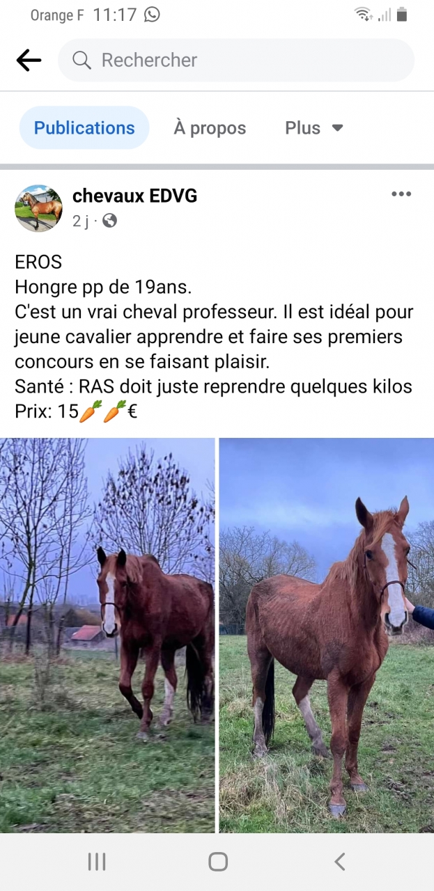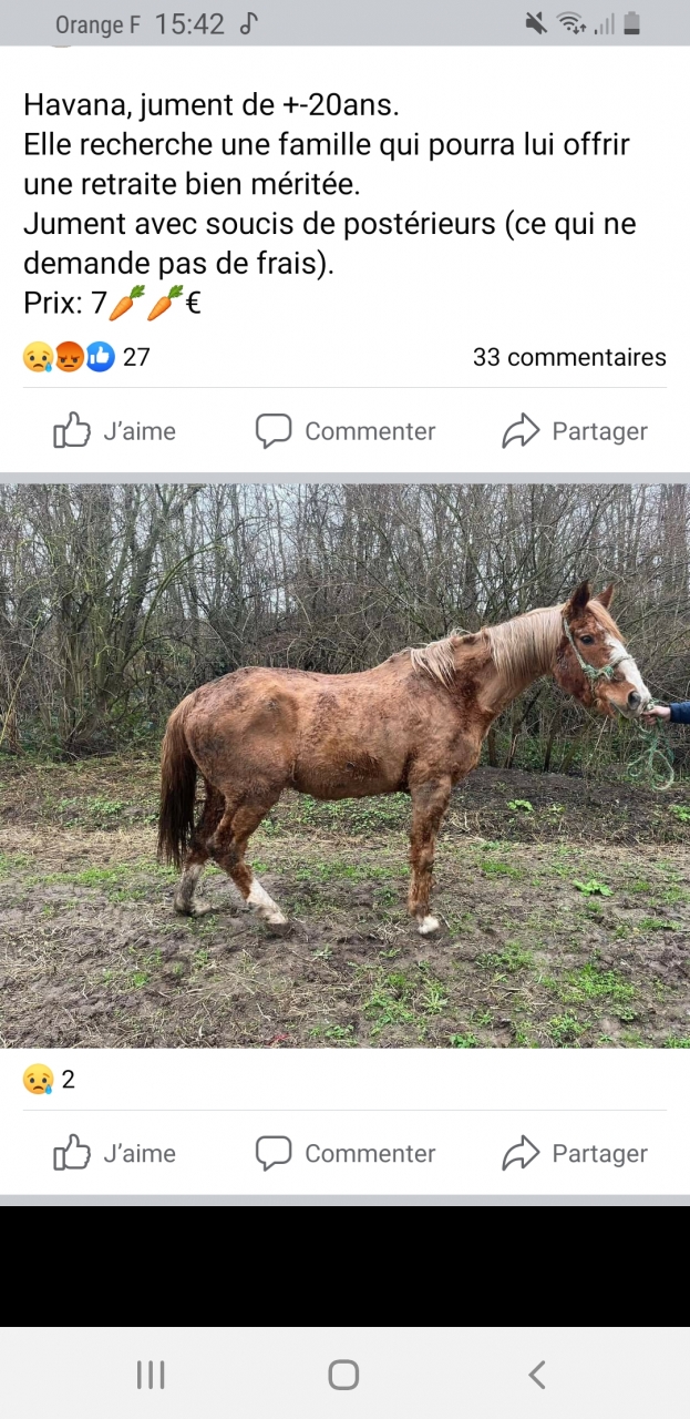 | Dire merci | carodadou : eux, ce sont des spécialistes, ils changent d'ailleurs régulièrement de nom sur FB. Tu as régulièrement des retours de gens assez naïfs qui ont acheté le "cheval parfait" chez eux qui s'avère plein de problèmes de santé, et des trucs vraiment hardcore. Soit ils présentent le cheval "gentil, ne mord pas, ne shotte pas, parfait pour débutants" soit une misère comme là en mode "on l'a sauvé", mais je pense qu'ils achètent des lots et refourguent en jouant sur la corde sensible et en se faisant une marge en passant et/ou en se payant le luxe de faire des cagnottes. C'est d'ailleurs plutôt ces "sauvetages" qu'ils font dernièrement. Bref, j'ai un mot pas très poli pour les désigner ; je pense que tu as assez de vocabulaire de charretier pour imaginer lequel. |