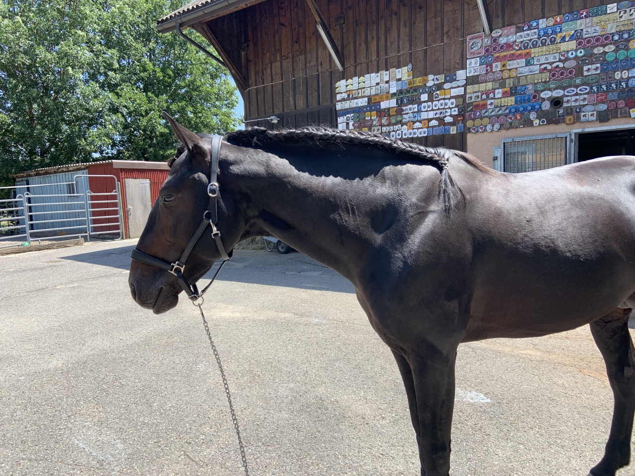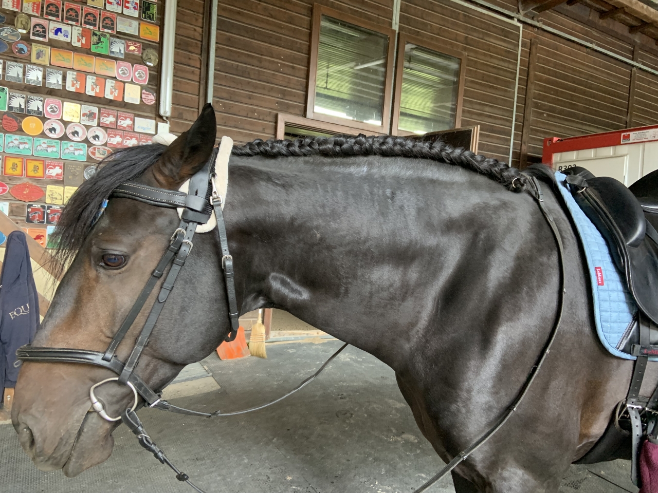 | Dire merci | Crinière sale, c’est déjà le cas et ça ne tient pas longtemps quand même. Sur le dessus et dans l’axe j’ai essayé, le problème c’est qu’il secoue la tête parce que ça lui tire les crins. Ça n’est pas le fait qu’il descende l’encolure qui détend la tresse, on a pas eu le temps. Je tresse, je le détache et c’est parti pour le secouage de tête. |