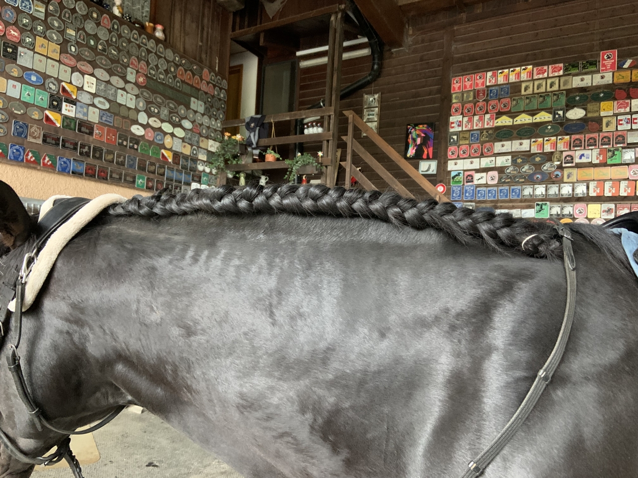 | Dire merci | J’ai jamais fait de tresse d’étalon, mais pour pionter je mets toujours de l’eau sucrée. Surtout pour les pions CSO. En dressage je serre volontairement moins les tresses. Ça tient quand même largement mieux avec les crins qui accrochent. |