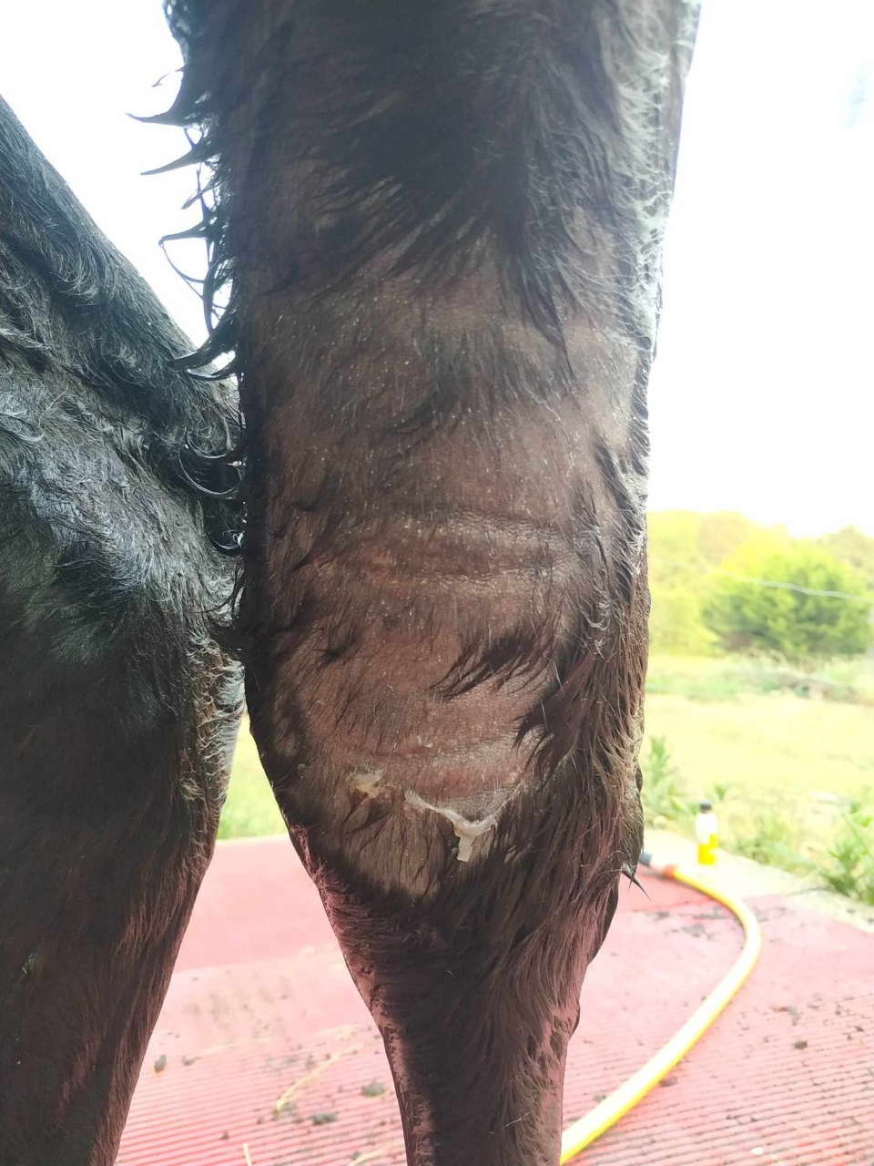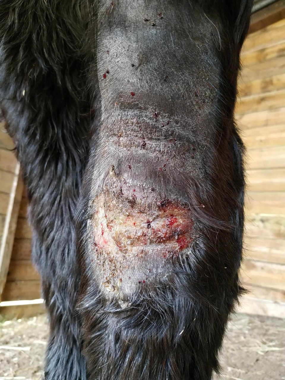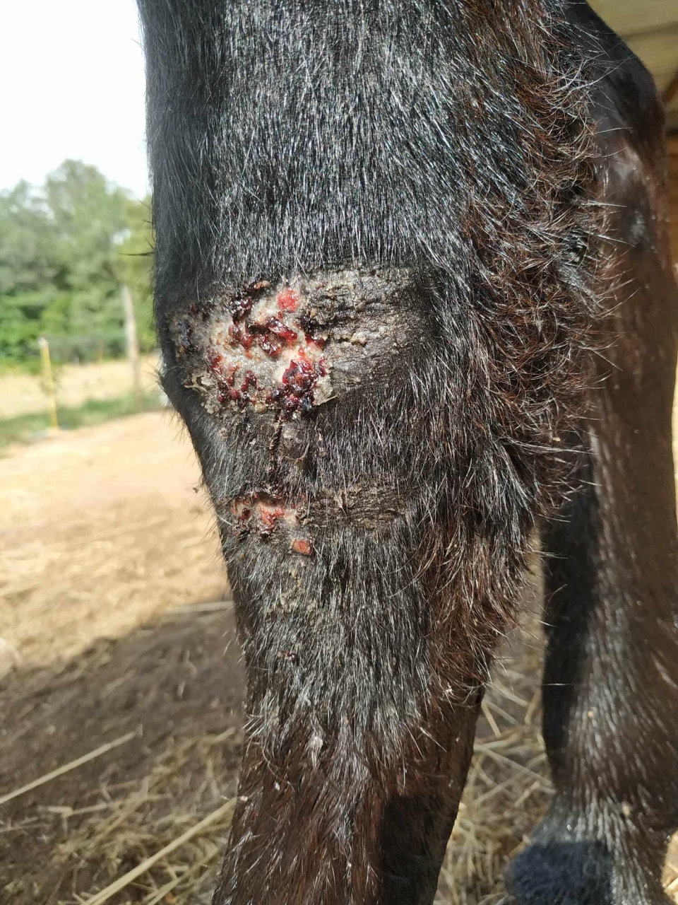 | Dire merci | Petit up j'ai trouvé ce soir une ânesse avec le pli du jarret dans un terrible état. J'ai cru qu'elle s'était accrochée qq part c'était vraiment très très moche on a eu très peur. En nettoyant on a vu que ce n'était pas traumatique mais une réaction inflammatoire ++++ auto immune . Le veto préconise le moins de lavement possible sauf si sale. Des anti inflammatoires et protéger des insectes. C'est exactement la même gueule que ta plaie mais en version hard... bouillant. |