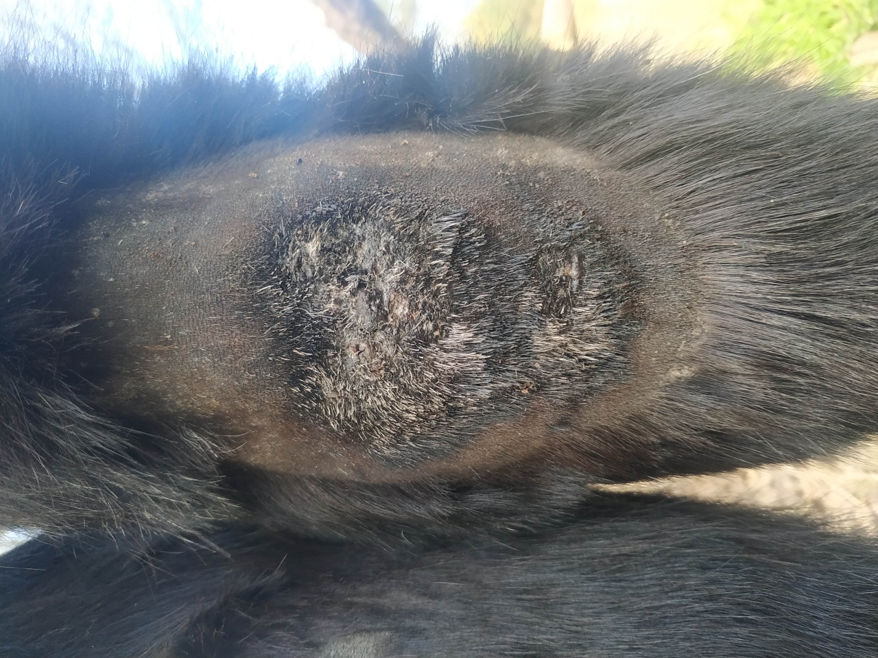 Début des problèmes en juin 2023, un poteau gonflé et chaud, peau qui suinte (on voit une plaque "grasse" qui se détache), poils qui partent - véto, antibios ![]() Apparition progressive d'une plaie - ![]() Quelques semaines plus tard, été 2023 - véto mais je ne sais plus ce qu'on a fait à ce moment-là ![]() A l'automne il enchaîne les abcès de pied, il voit le véto deux fois Fin d'hiver je pars 8 jours en déplacement pro, c'était relativement propre, je reviens, c'est la cata. Re re re re véto, deux biopsies, crème aux corticos Au début du printemps on en était là... ![]() Et là c'est reparti (à cause du retour des insectes ?), ça suinte de nouveau, j'ai pas fait de photo J'ai un peu honte, c'est pas beau, on dirait que je l'ai laissé sans soins... mais je vous assure que je soigne tous les jours depuis tout ce temps, sauf exception (quand je pars quelques jours en déplacement, ce qui est rare), et à la moindre relâche ça repart en sucette Ces derniers temps je mettais du picri baume, j'ai l'impression que c'est ça qui a redéclenché le bazar. |