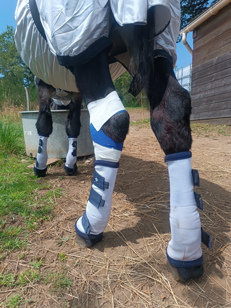 | Dire merci | Je reviens donner des nouvelles. Rien n'a évolué depuis, on entame le 18eme mois avec cette plaie ![]() On a revu le véto mardi, qui ne sait plus trop quoi faire. J'ai arrêté les pansements, j'en ai fait pendant 3 mois, ça a bien limité la casse mais ça repart à la moindre relâche... Le look de la bête cet été, entre la dermite, les pattes attaquées sévère par les mouches et le pansement ![]() ![]() Le véto ne juge pas nécessaire de tester Cushing. Je continue à doucher de temps en temps au septivon, c'est tout, c'est moche, il vit avec, en espérant que ça ne parte pas en sucette à force. Je l'aime (mon âne, pas le véto),.il est formidable ce gros pépère de 400 kilos qui a enquillé 12 km à pied aujourd'hui tenu par une petite fille de 6 ans, attentif à elle, doux, respectueux, c'est une perle... mais sérieux je suis vaccinée, les bestioles après lui c'est terminé. Je relis ce post et les nombreux conseils, dont celui de contacter Equitom, mais c'est clair que je ne l'emmènerai pas là bas |