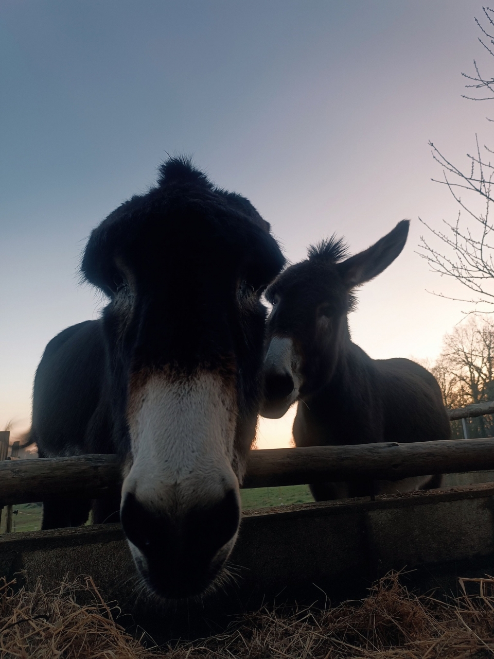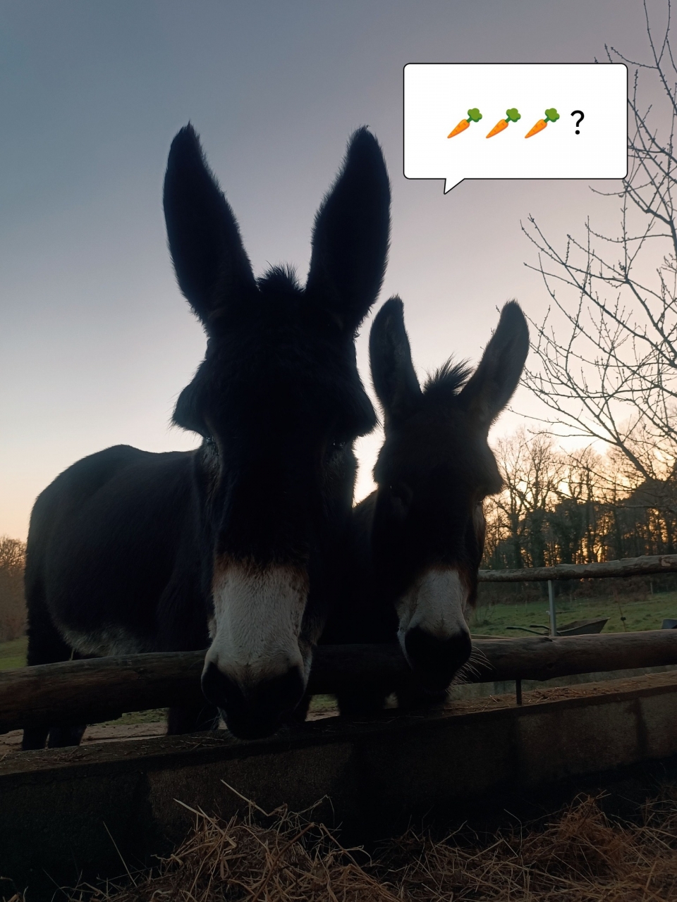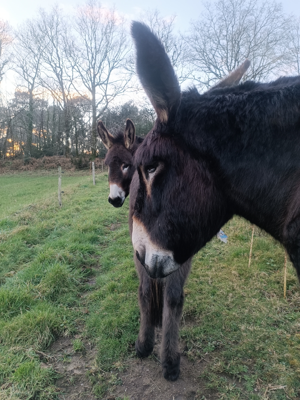 | Dire merci | Allez, pardon de ne venir ici que pour geindre, mais franchement, j'aimerais que le mauvais sort s'acharne ailleurs que sur mon brave compagnon... Il a remonté la pente ces derniers jours, repris du poids, retrouvé de la vie dans son comportement et ses interactions. Aujourd'hui, nous décidons donc d'atteler le van et d'emmener les deux ânes en balade à pied dans les landes près de chez nous, en se disant qu'on ira à son rythme. Il était heureux, allant, motivé, curieux, les oreilles en avant. Une vraie joie de le voir ains !! On a fait un tour de 6 ou 7 km impeccable et puis à 500m du véhicule, un tout petit passage un peu escarpé, sur le chemin en sous-bois. On y est déjà passé 10 fois sur cet itinéraire ces dernières années, sans jamais rien remarquer de spécial. C'est mon conjoint qui le tenait en tête, j'étais juste derrière. Sauf qu'il n'a pas vu qu'un trou s'était formé entre deux rochers. J'ai vu son antérieur droit disparaître jusqu'au genou dans ce trou de 20 cm de diamètre. Il s'est dégagé, j'ai pas eu le temps de crier stop qu'il a continué et y a collé... le postérieur, jusqu'au jarret qu'il a vite dégagé aussi.Tout s'est passé en une fraction de secondes. J'ai fondu immédiatement en larmes, en boucle, "il s'est pété les jambes, il a mal c'est un cauchemar c'est un cauchemar", j'ai cru virer folle au milieu des bois Bon, on a pu rentrer, il était raide mais il marchait. Je viens d'aller le voir, à froid.. boiterie postérieur droit (il pose quand même.), légèrement gonflé. Pour une fois qu'il avait l'air de n'avoir mal nulle part et qu'on prenait du bon temps.. Le répit aura été très bref Ça m'a demandé beaucoup d'efforts de faire bonne figure ensuite au réveillon. Affaire à suivre demain, mais là je psychote... |