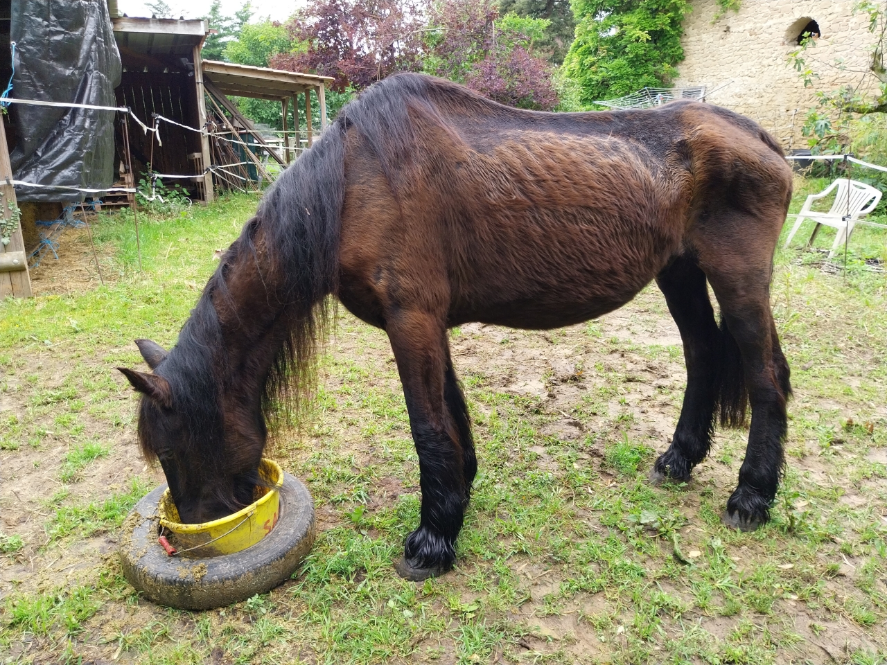 | Dire merci | Non il ne pue pas de la bouche. Il voit la dentiste 1 fois par an. Elle dit qu'il a les dents complètement usées, pas qu'elles sont pourries. Et elle a limé ce qui était susceptible de le blesser. Le foin il pinaille dessus, recrache, en met plein l'abreuvoir... La jeune herbe de printemps ne lui pose pas de problème (mais du coup elle contient plus de sucres...) Donner 3 fois par jour c'est compliqué avec le boulot, et oui, le coût aussi joue. Je ne mets pas plus dans le seau, il est plein aux 2/3, ça fait beaucoup de volume en une fois. Et s'il ne finit pas car rassasié, la jument qui lui tient compagnie va aller se servir, et honnêtement elle c'est l'inverse, en ce moment elle est obèse ![]() |