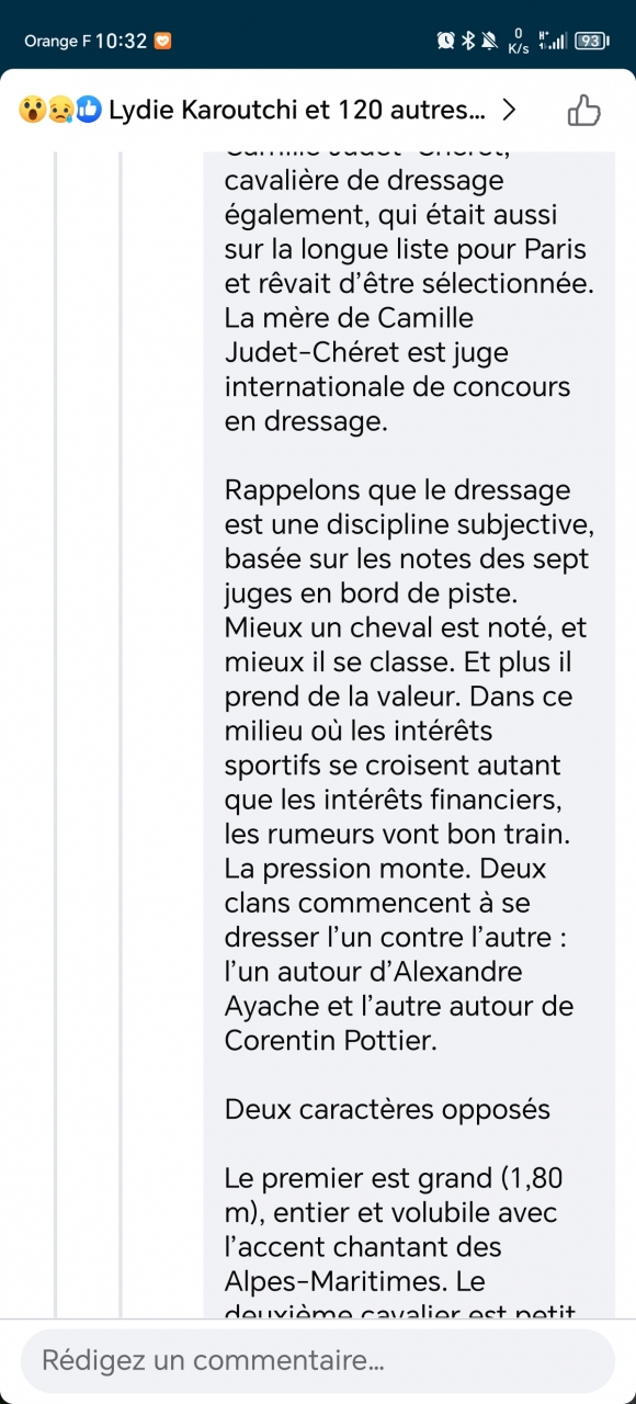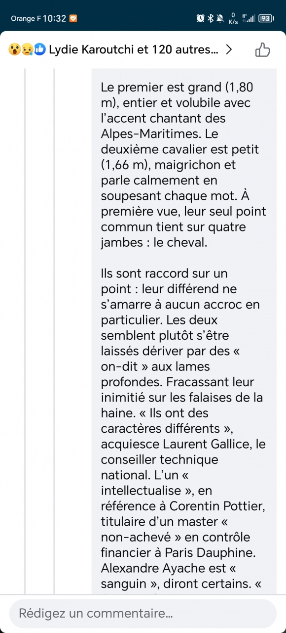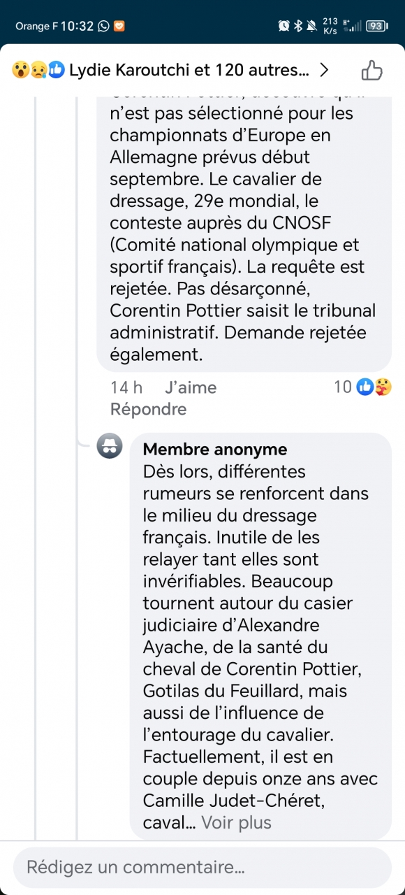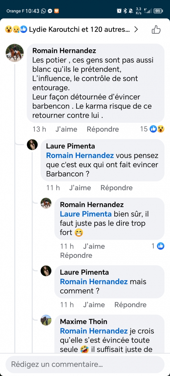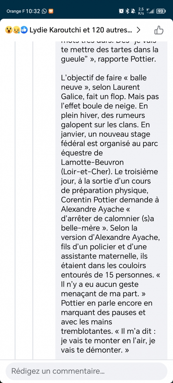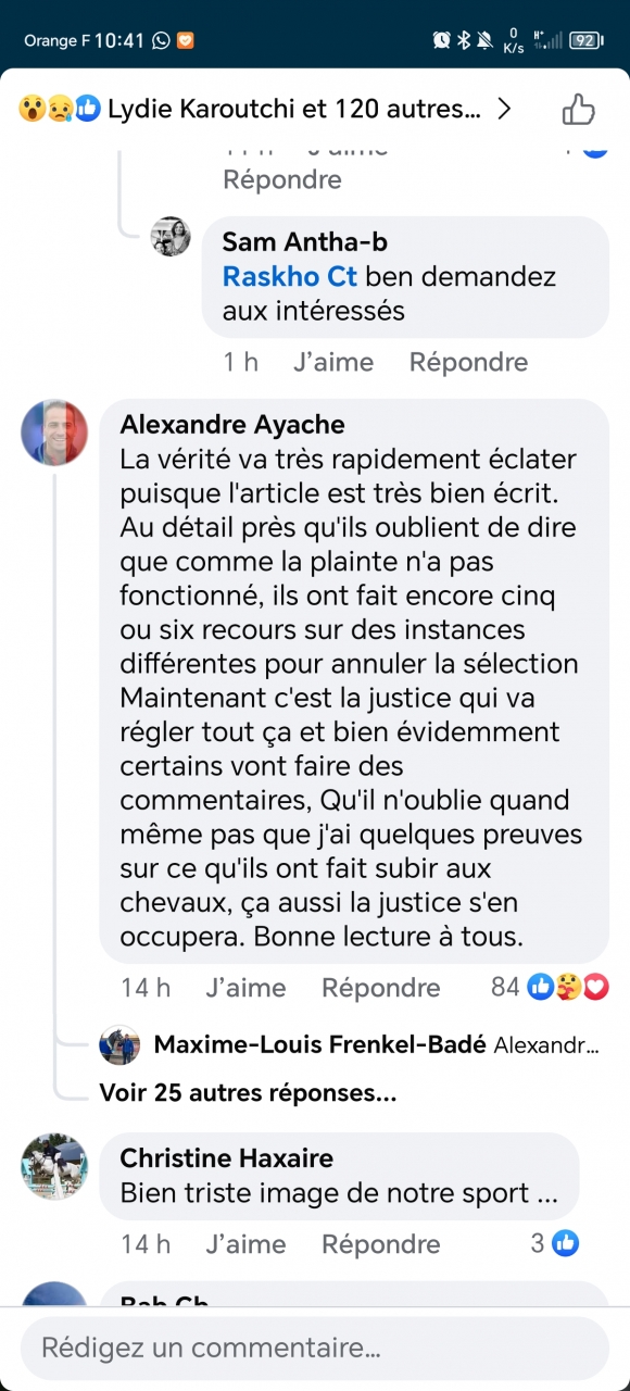 | Dire merci | Pamfou est connu pour être assez procéduriers... mais ils perdent souvent Il faut les voir quand ils débarquent à un concours... tous sortis de la cuisse de Jupiter. Ayache je l'ai vu une fois sur un concours et pour le coup il était plutôt très discret (contrairement à ses coups de gueules sur les réseaux )En tout cas ça donne pas une belle image de notre sport (déjà que le dressage n'a plus vraiment la cote ) |