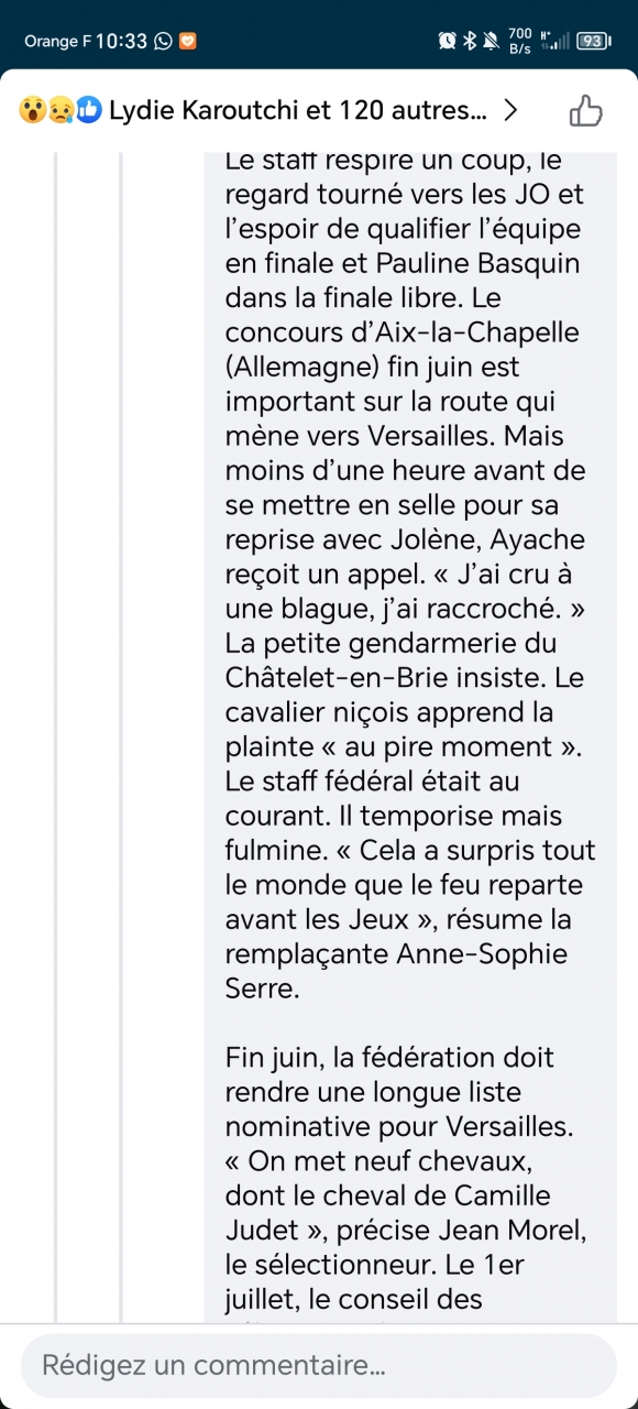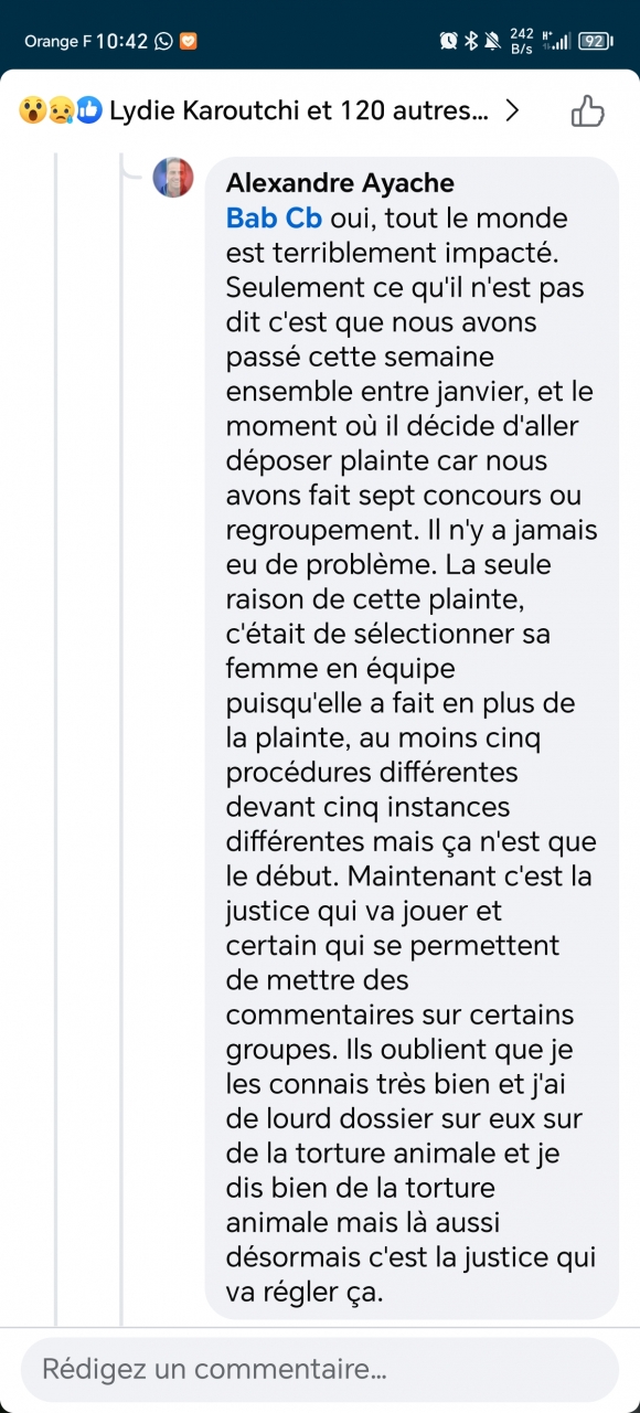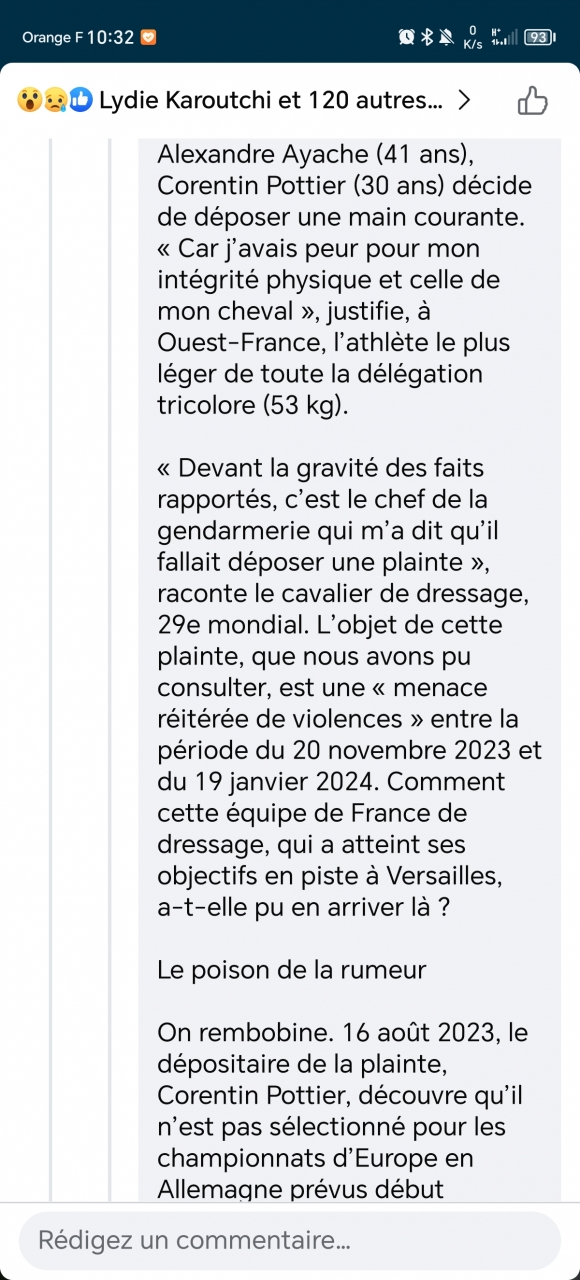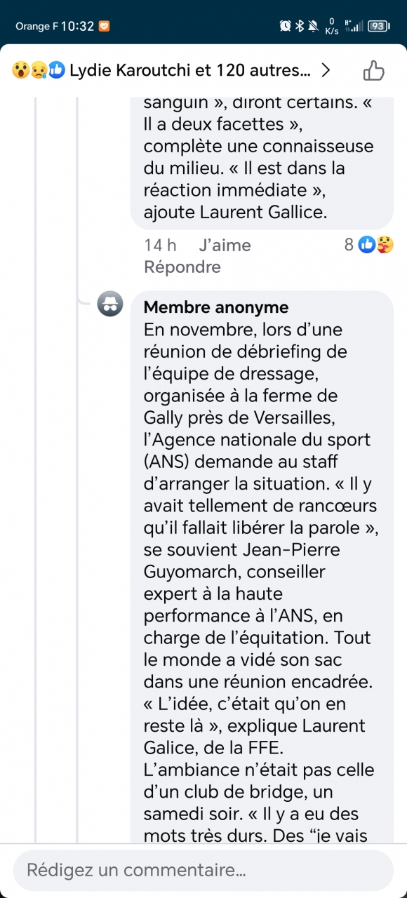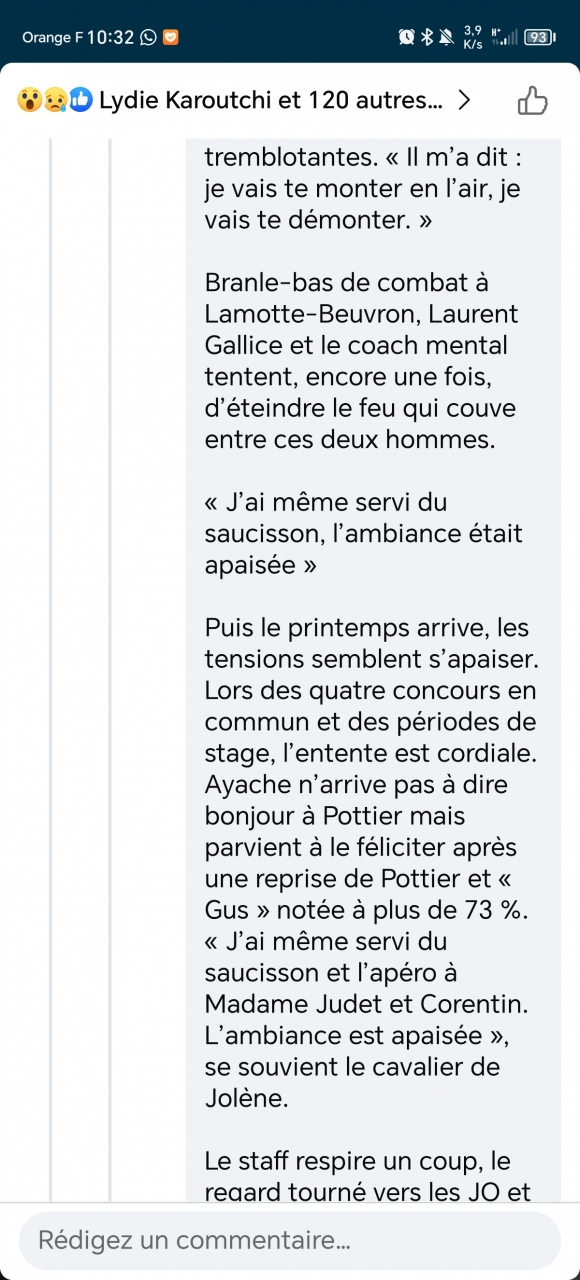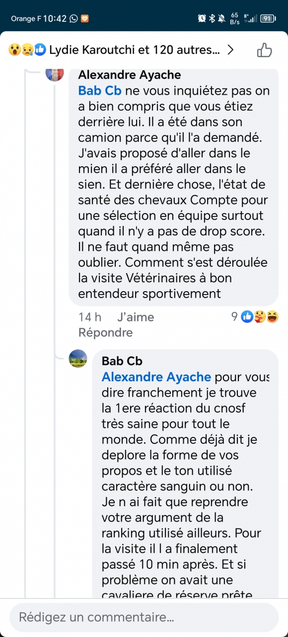 | Dire merci | Pamfou est connu pour être assez procéduriers... mais ils perdent souvent Il faut les voir quand ils débarquent à un concours... tous sortis de la cuisse de Jupiter. Ayache je l'ai vu une fois sur un concours et pour le coup il était plutôt très discret (contrairement à ses coups de gueules sur les réseaux )En tout cas ça donne pas une belle image de notre sport (déjà que le dressage n'a plus vraiment la cote ) |