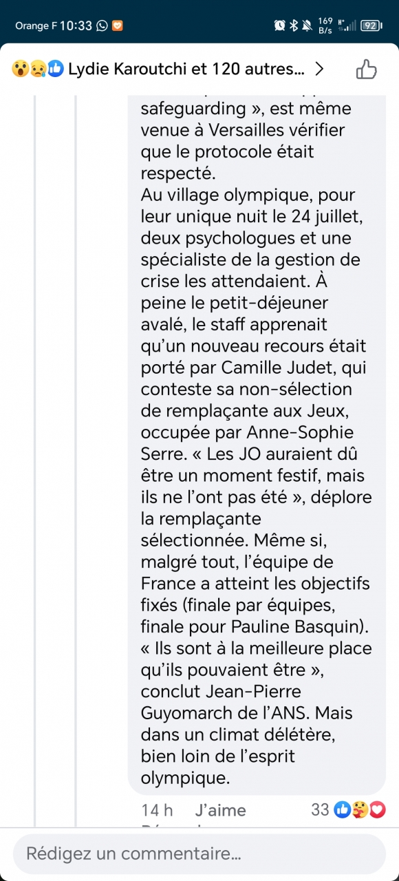 DéconnectéDire merci | C'est pas moi qui ai dit ça, mais je suis d'accord aussi. C'est marrant c'est pas la première fois qu'on t'attribue mes blablas Le problème spécifique entre les deux vient d'une critique assez récurrente vis à vis de Pamfou, qu'Ayache a dû reprendre plutôt frontalement là où d'autres sont plus indirects. Mais Pamfou est plus généralement en conflit aussi avec le sélectionneur et la fédé. Sa belle mère était une juge 4* Elle est toujours juge en fait, 5* plus exactement. Situation de conflit d'intérêt évidente, que les reproches soient justifiés ou non. Message édité le 08/08/24 à 12:41 |