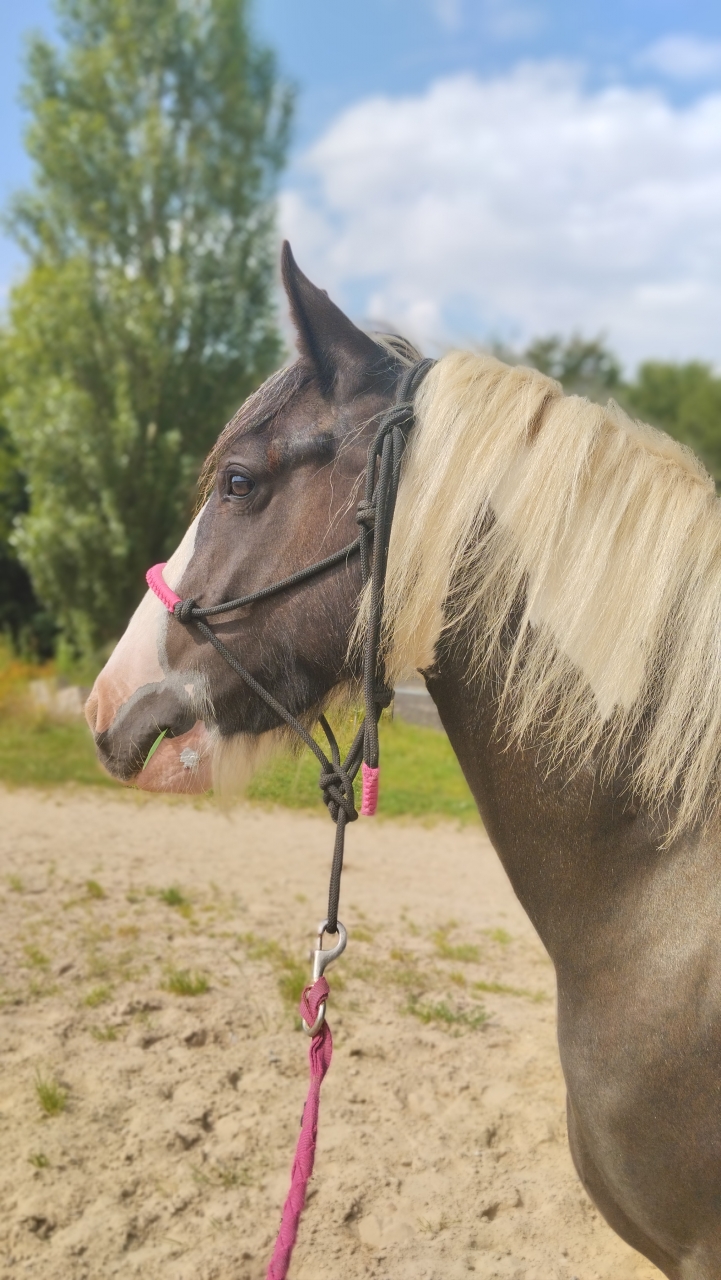 | Dire merci | Sinon, il faut quand même que je présente la mienne. C'est une fausse L puisqu'elle s'appelle Sierra C'est une Onc venue d'Irlande.Elle est arrivée en France en mars 2024 et je l'ai acheté le 6 mai 2024. Lors de son essai, j'ai pu monter dessus pcq on me l'a vendu comme débourré mais je n'y crois pas vraiment. On va dire qu'elle accepte le cavalier sur le dos. Mais pour le moment, on ne fait que du travail à pieds, on apprend à se connaître, à établir nos codes. ![]() ![]() Au niveau évolution: - elle ne sortait pas de la pâture > elle le suit partout maintenant - elle ne se laissait pas toucher les jambes > je peux lui prendre les antérieurs quelques secondes - elle avait peur d'un âne > on peut passer à coté maintenant Nos objectifs : - essayer de la longer - continuer à prendre les pieds, pour espérer faire venir le maréchal - prendre une douche |