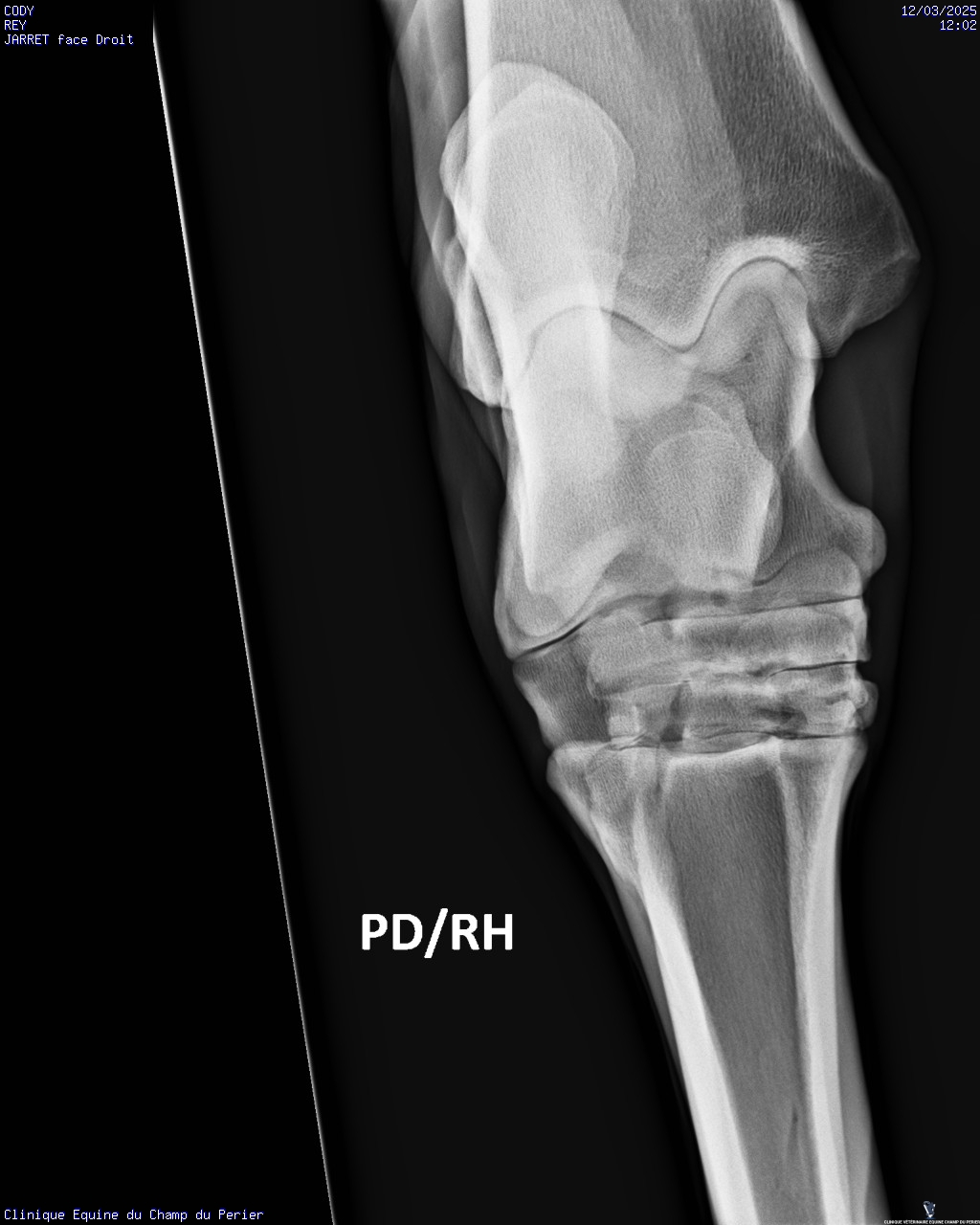 | Dire merci | Voici les résultats : - pieds antérieurs : novembre 2024 : perte de parallélisme entre les 3° phalanges des deux antérieurs et les sabots-parois dorsales ; pieds trop longs en pinces - pieds postérieurs ce jour : très léger défaut de parallélisme entre P3 et parois dorsales des sabots, mais pinces trop longues. Un défaut en phase de correction sou le sabot PG, en ponte de fourchette. On note aussi un ostéophyte au sommet dorsal de P2 sur le PD. - jarrets : on note sclérose des os centraux et troisièmes os des tarses + lyse forte de ces deux os sur le jarret gauche Ccl : comme indiqué sur mon ordonnance il faut : - parer les sabots afin d’obtenir au fur et à mesure le parallélisme entre les 3° phalange et les parois dorsales des sabots ; parer les pinces des sabots au plus court - poser des fers qui seront bien reculés et donneront de la surface d’appui en talons, sur les deux antérieurs - soulager la douleur pour les deux mois à venir avec Equioxx° un comprimé par jour. Le contrôle des enzymes rénales – normales – fait se jour le permet. - traiter CODY avec des biphosphonates (Osphos°, voire Tildren°) |