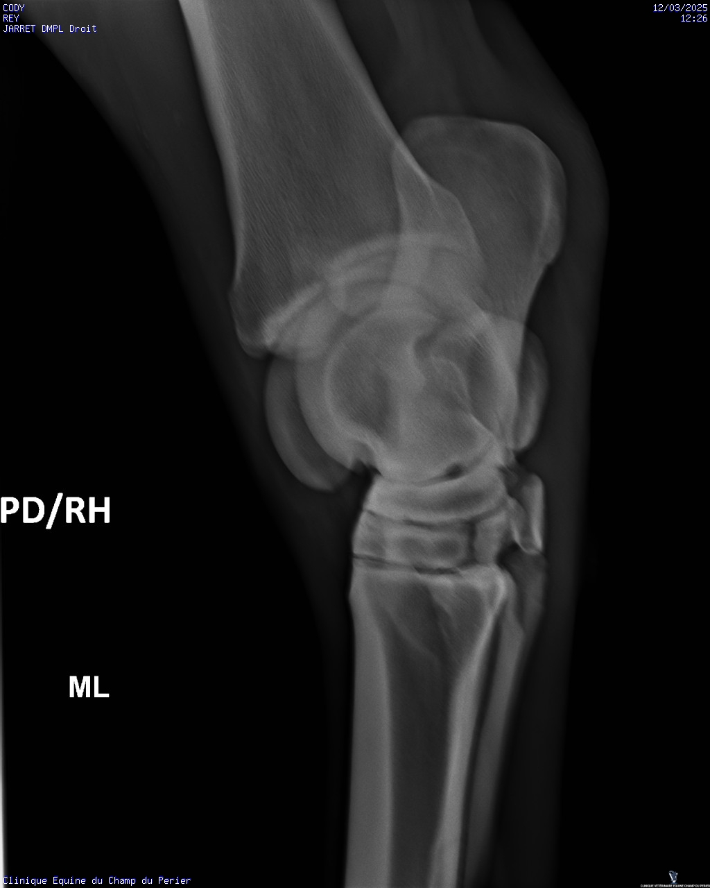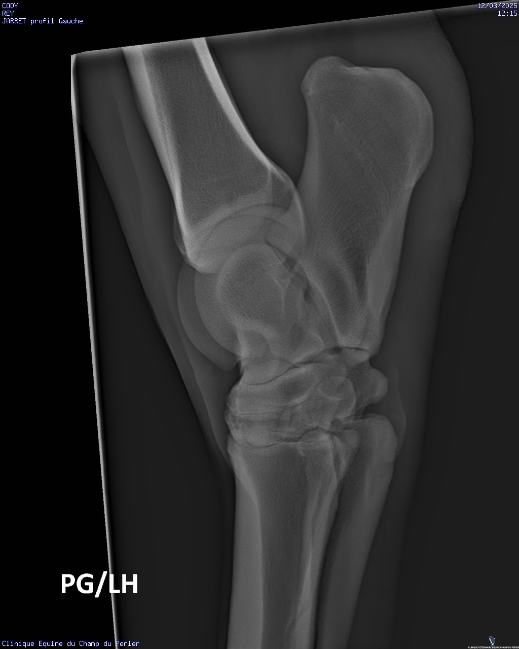 | Dire merci | L'état du jarret gauche n'est pas bon. Il n'y a jamais eu de radios de faites, les différents pros m'ont dit que c'était sa conformation. J'ai dû insister pour faire les radios. Avec mon véto habituel on va programmer un tildren assez rapidement. Cody va prendre 11 ans cette année. De ce que j'ai compris les antérieurs douloureux font qu'il y a un report du poids sur les postérieurs. La priorité est de soulager la sensibilité des antérieurs, pas de chance le maréchal-ferrant s'est trompé de taille de fers, le ferrage est reporté de 10 jours. En attendant je dois donner un cachet d'equiox par jour. |