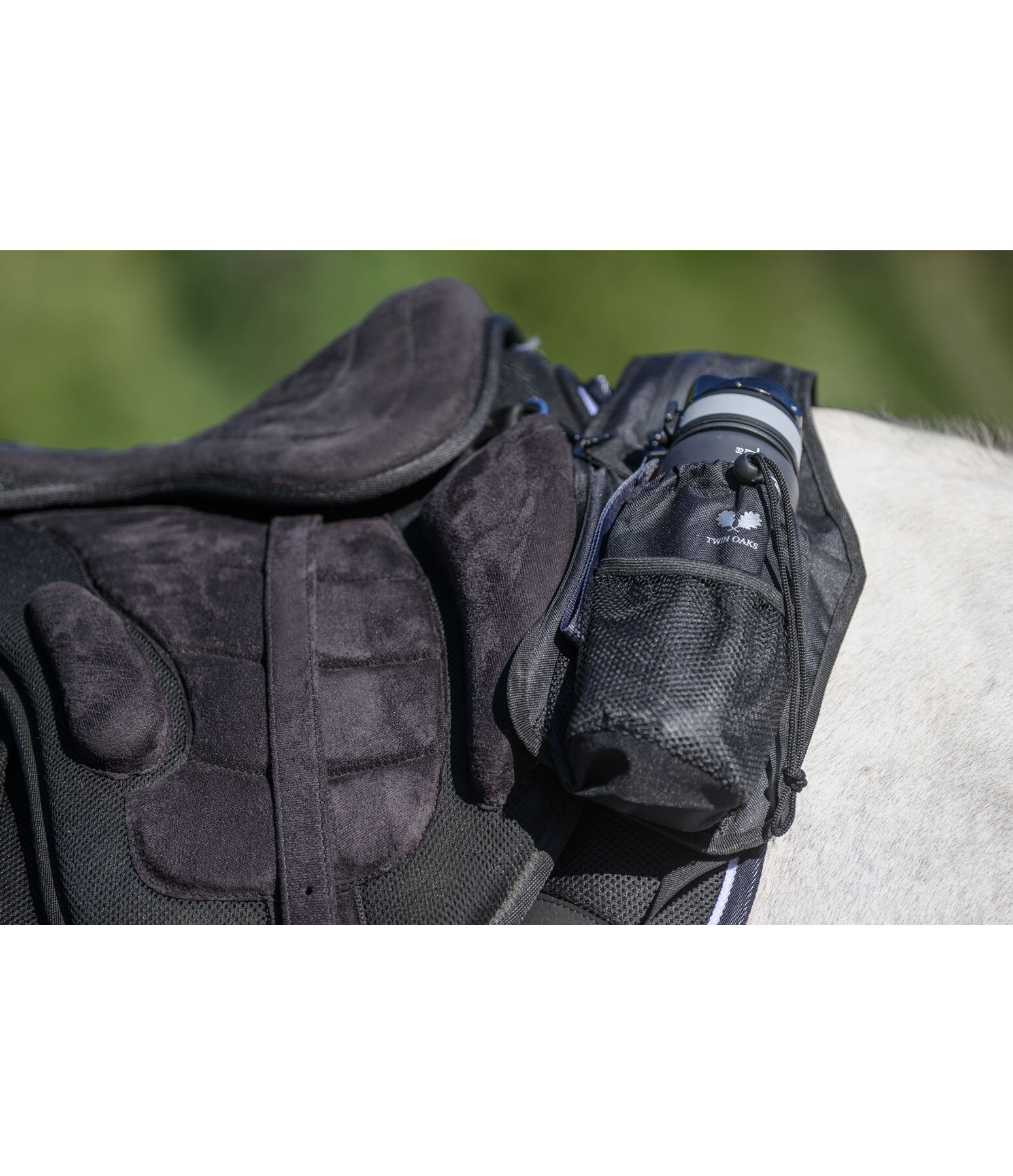 DéconnectéDire merci | Moi j'ai une sacoche de troussequin du genre de celle celle ci : Lien Ça permet de loger 2 gourdes accessibles facilement, ou 2 petites bouteilles d'eau. Pas de problème au galop. |