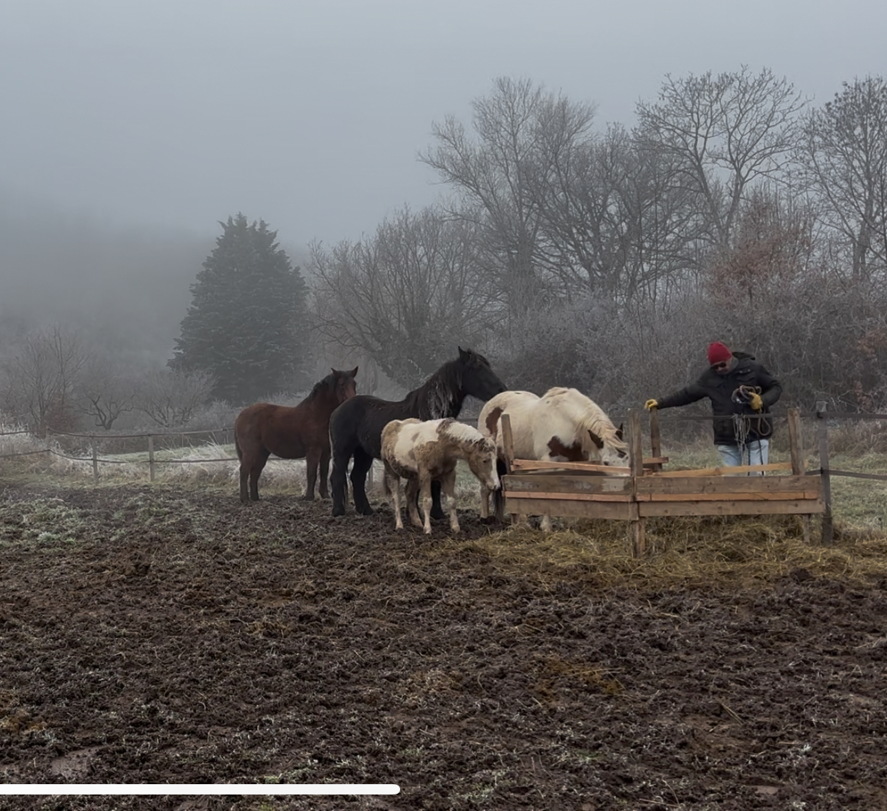 | Dire merci | bravo dory il est super chouette moi pour le moment c'est la balle dans un filet et dans un bac à eau ou sur un pneu de tracteur si la balle est trop grosse pour le bac L'idée va être de stabiliser la zone devant le manège et ensuite de prévoir un ratelier qui pourra rester tout l'hiver. Je pense voir avec un copain qui est menuisier à faire qqchose de pratique et sécure |