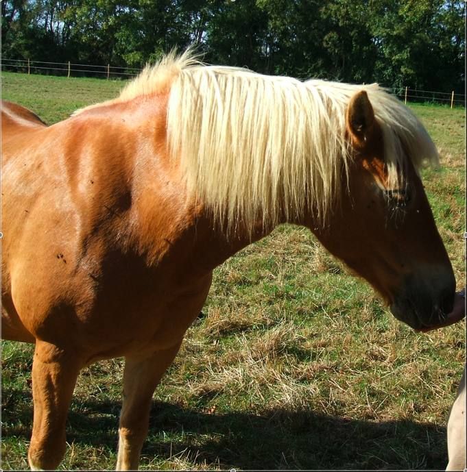 | Dire merci | Bonjour tout le monde. Moi aussi j'ai craqué pour un haflinger (alors qu'avant je ne voulais surtout pas un poney). C'est un jument de 12 ans, elle est PP et a un très gros ventre!!! lol Elle est gentille comme tout même si ça faisait longtemps qu'on ne s'occupait plus d'elle. Normalement je l'achète en janvier (je m'en occupe en demi pension depuis juillet). Je mets des photos, dites moi ce que vous en pensez.[édité par erzie_modo] |