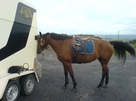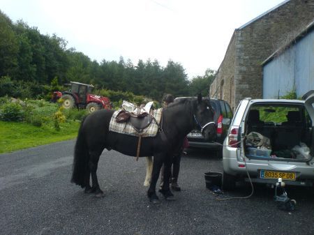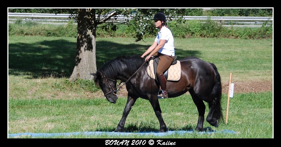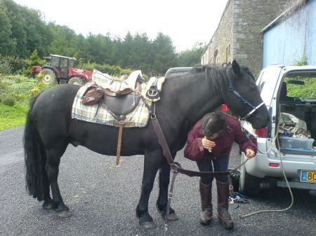 | Dire merci | Moi c'est nul je peux meme pas regarder tout ça lol ! Déjà à la base mon cheval il s'appellait Liberté lol, mais comme aucuns papiers rien, c'est moi qui ai tout fait je l'ai rebaptisé Blacky. Et je regrette pas ça lui va trop bien. Hier je me suis rendue au pré, j'ai d'abord attrappé Rosie que j'ai mis prés de la porte et je suis allée chercher Blacky, maintenant petit rituel, il fait mine de venir puis tourne autour de moi, alors moi je l'ignore et j'attends que monsieur daigne s'arreter et là je m'approche pour l'attrapper. Je ne comprend pas vraiment la signification de ce rituel mais il me le fait à chaque fois maintenant, avant c'était occasionnel maintenant c'est tout le temps. Si j'essaie d'avancer quand meme il fuit, du coup je préfére attendre mais j'aimerais quand meme comprendre pourquoi il me fait ça maintenant. Si je viens sans licol parfois il le fait, parfois non bizarre. Puis nous avont préparé et sommes partis chevaux bien motivé ça faisait plaisir, mais juste ce qu'il faut. Il a meme réussi à galoper devant Rosie dans un champs car madame est un peu chochotte si c'est trop mouillé elle n'aime pas, lui c'est le genre de terrain où il est à l'aise j'adore. Par contre on s'est payé un chemin caillouteux je n'en pouvais plus, car Blacky marchait sur des oeufs et ça tout le long un vrai bonheur. Nous avons fais une pause d'1h chez un ami le temps de manger et de boire un coup, ça leur a fait du bien, ils sont restés tels que nous nous sommes arreté et que nous avons dessellé lol |