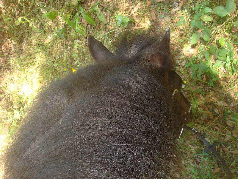 DéconnectéDire merci | L'autre jour j'ai câliné Isis la SBS... Et là qu'est-ce que je vois Ou plutôt qu'est-ce que je ne vois plus... elle n'avait plus aucun POIL ! Sa patronne est venue et l'a toilettée type "cheval de sport" et a tout coupé, aux oreilles, aux fanons, sous la barbe, partout on aurait dit un arabe de show (à part qu'elle fait 1m 75 tout en muscles grassouillets) Bah pas étonnant qu'elle fasse de la gale de boue,... Elle vit au pré maintenant ! Alors dès qu'il pleut elle n'a plus aucune gouttière d'évacuation d'eau la pauvre ![]() |
