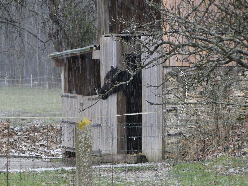 | Dire merci | Tout à l'heure, il a commencé à tomber quelques gouttes, rien de bien méchant, mais je vois mes deux juments qui reviennent du fond du pré d'un pas décidé, et qui rentrent directe dans l'abri ! Mais elles ne vont jamais dans l'abri, quand il pleut !... ![]() Ben 1m minute près, il tombait de ses cordes !!! Et puis le vent qui soufflait en rafale, et de la grêle... Ben je comprends pourquoi elles préféraient se mettre à l'abri !!! |