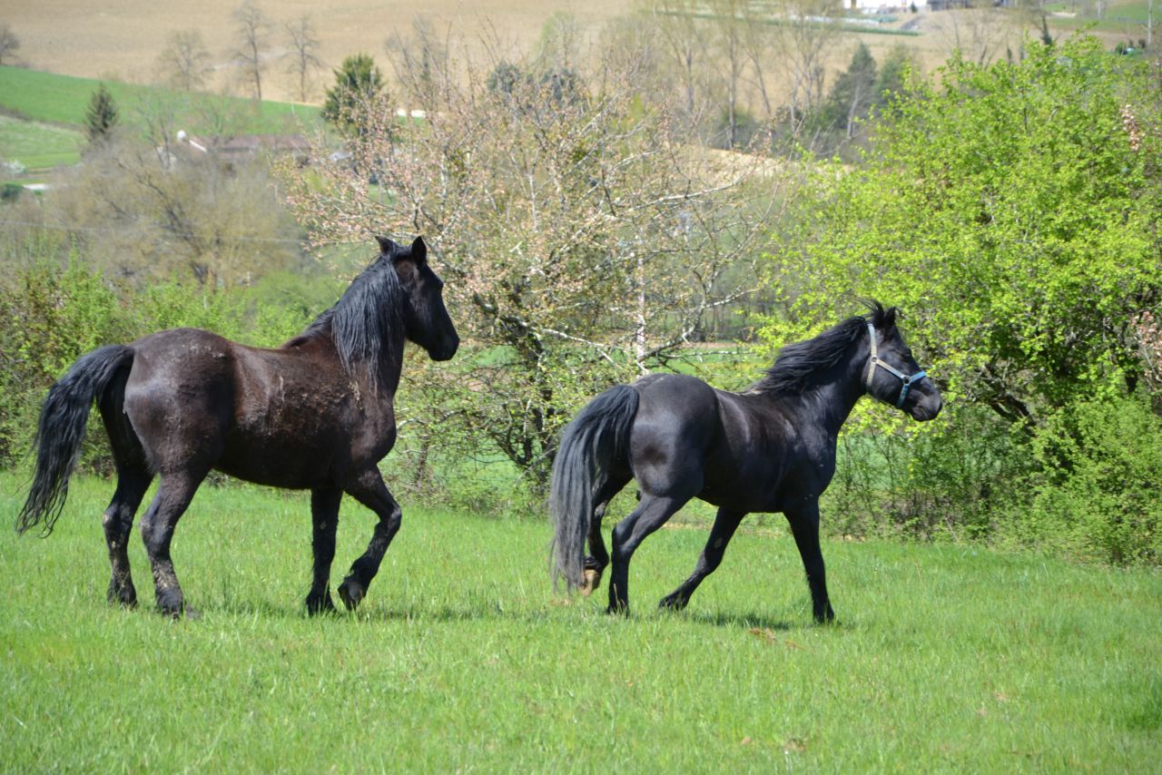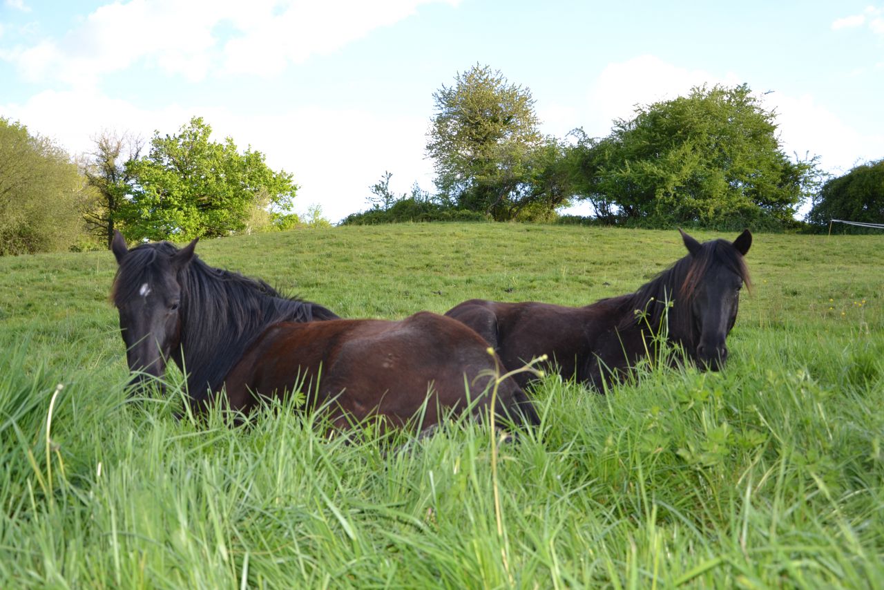 | Dire merci | C'est Quagancho qui saute et Vasco qui broute en arrière plan , et sur la 2ème photo, ceux sont Vasco et Branou qui sont couchés dans l'herbe. Je ne peux plus éditer, j'aurais du indiquer qui étaient les chevaux avant de mettre les photos, pour moi c'est facile de les reconnaître |